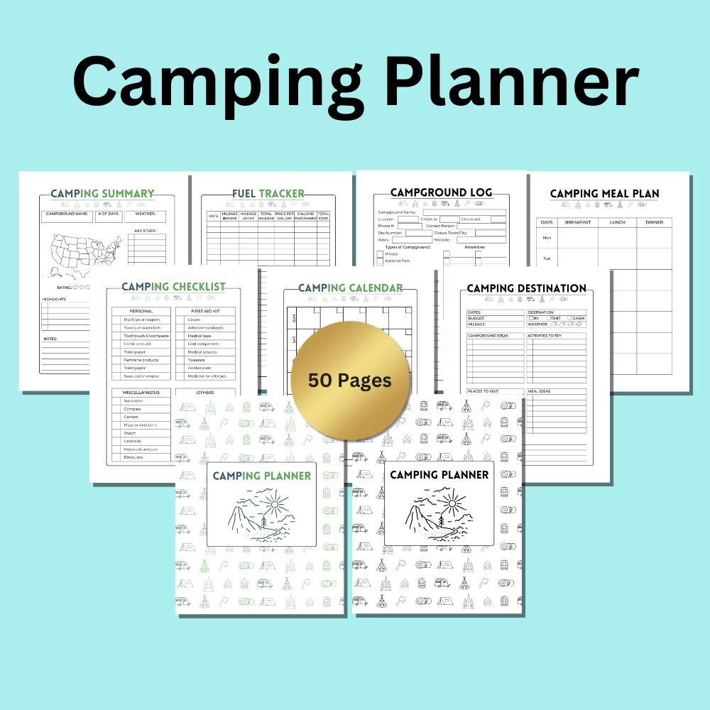 Make planning your camping trips so much easier with this 50 page Camping Trip Planner. Use it to keep track of where you'll go, the amenities, what you'll eat, what you'll pack, and much more. Included is a color version and a black and white version for your printing preferences.
