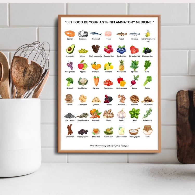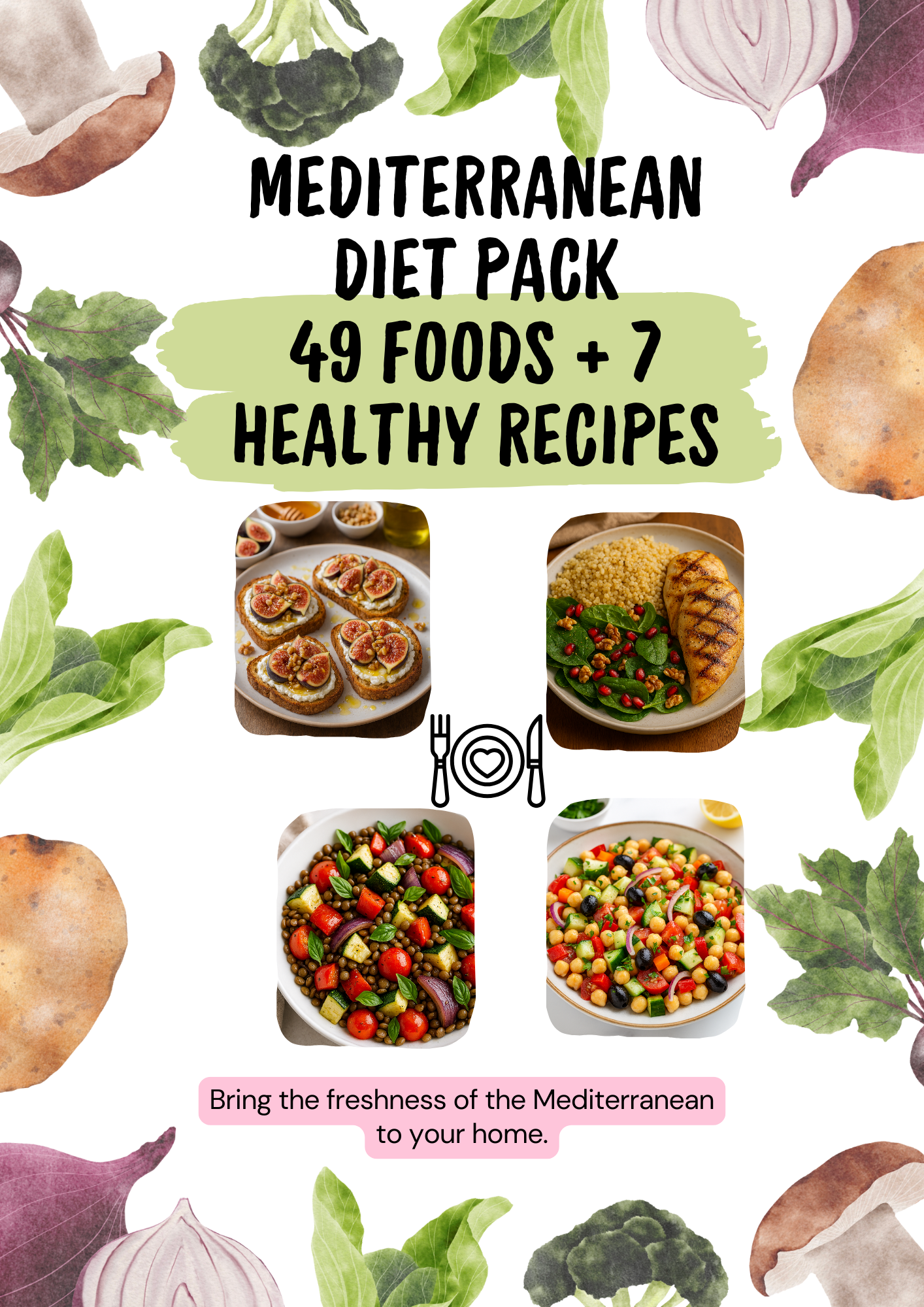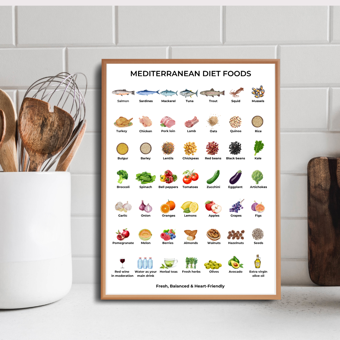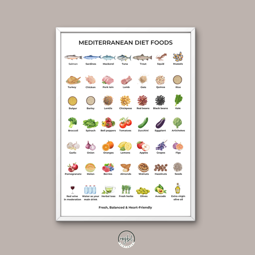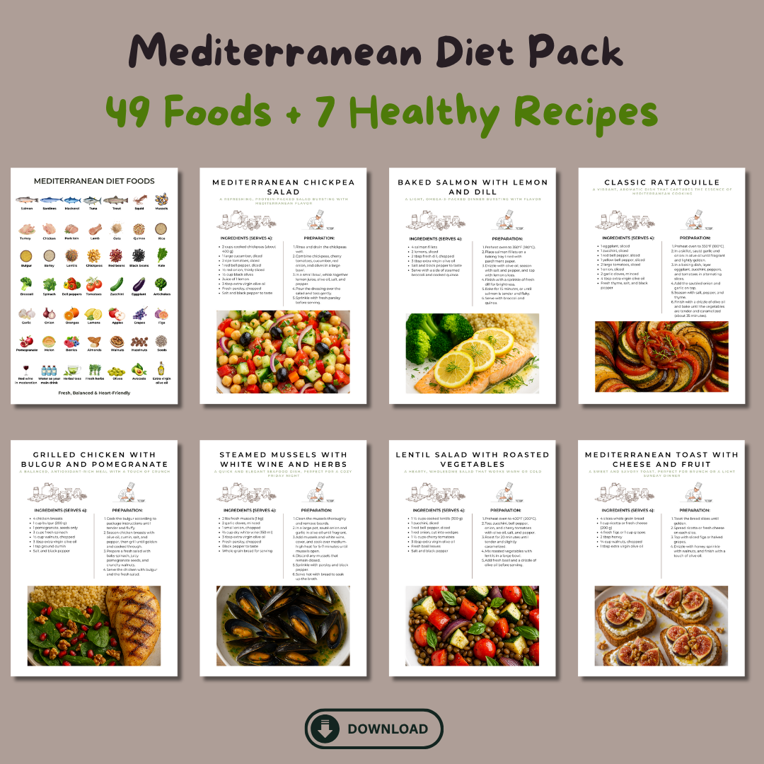 This digital pack includes a visual list of 49 Mediterranean foods and 7 healthy recipes, perfect to inspire better eating habits and decorate your kitchen beautifully.