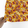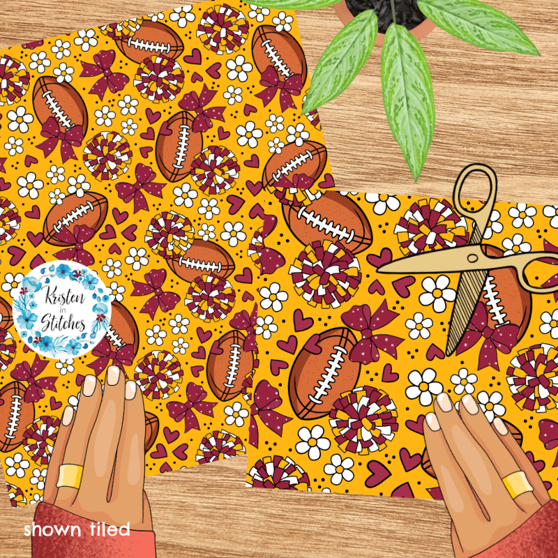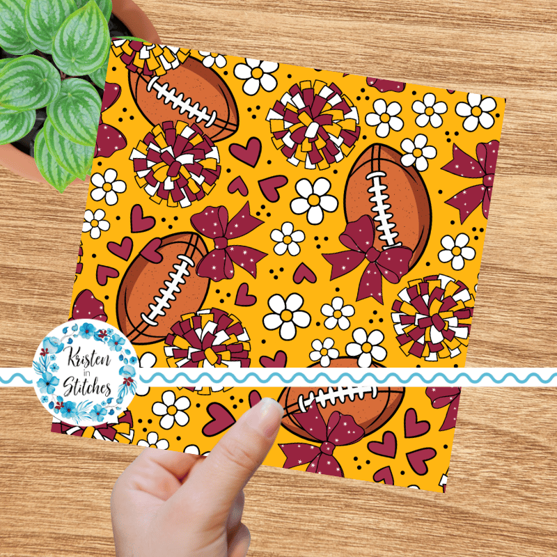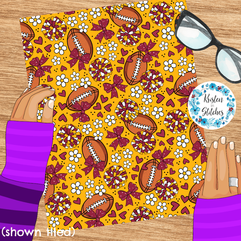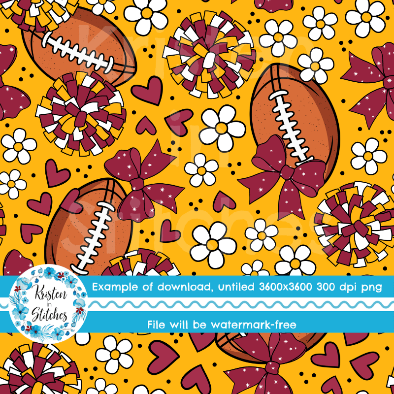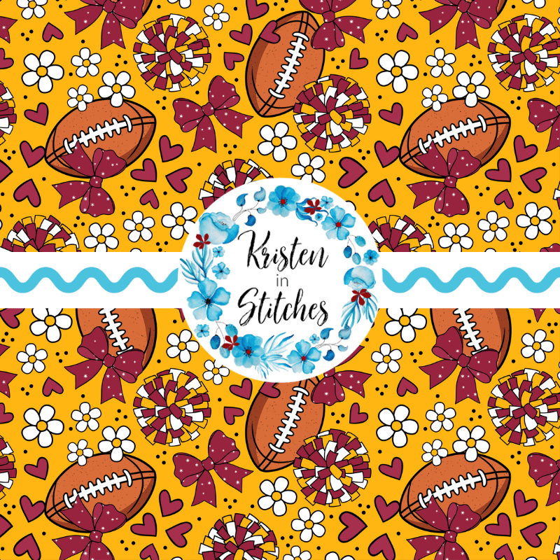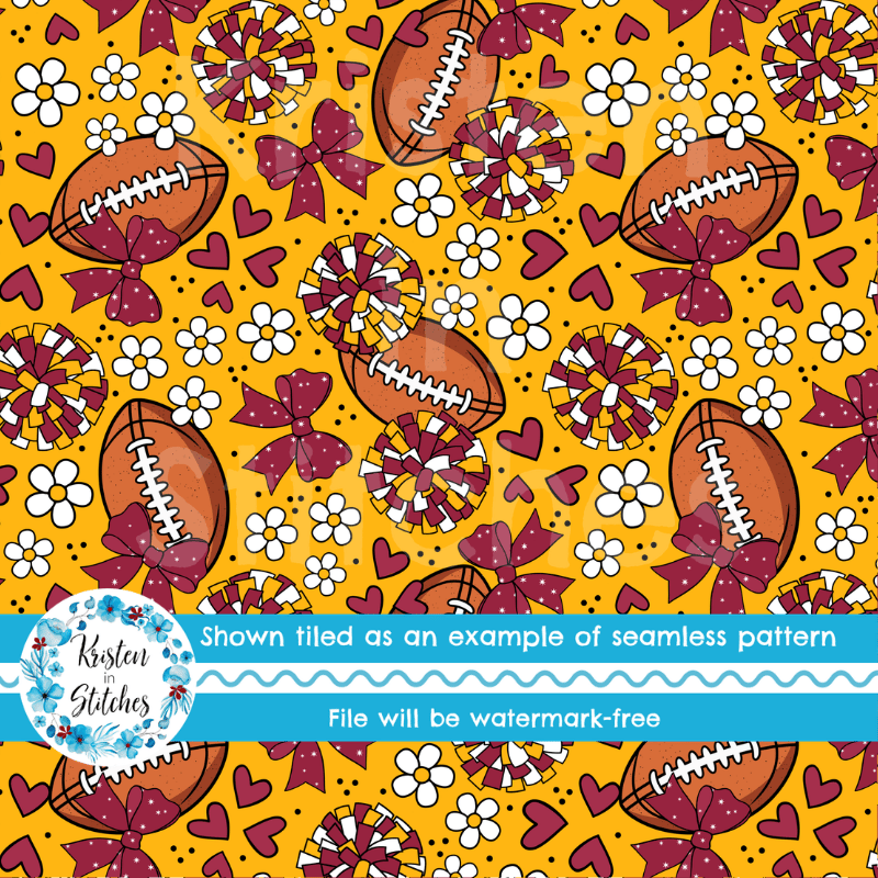 Floral pattern with daisy flowers, cheerleader bows, pompoms, footballs and hearts.