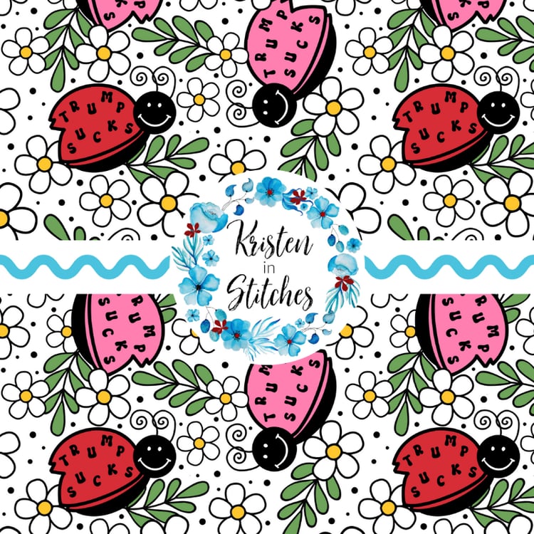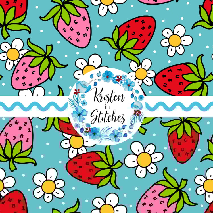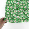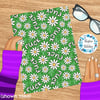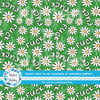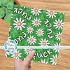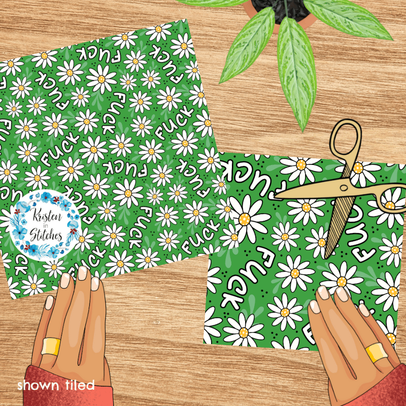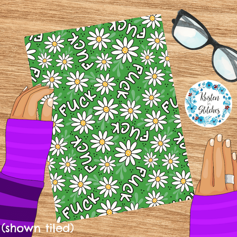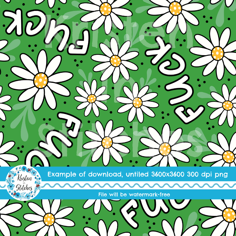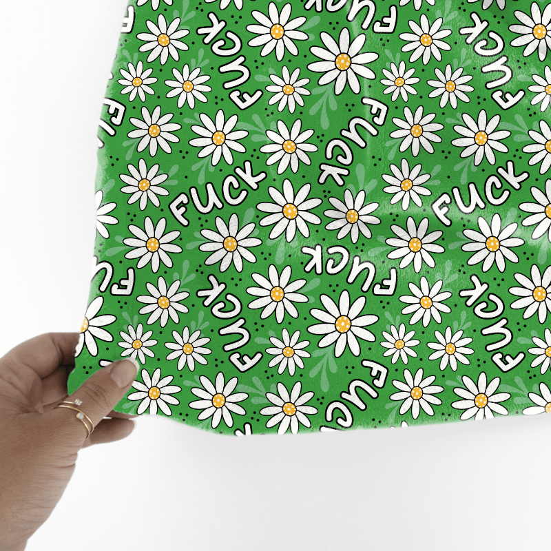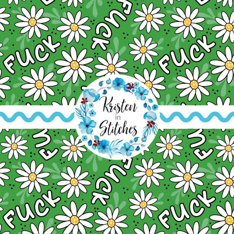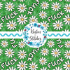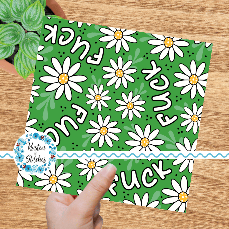 Pretty profanities- the f-word with white daisy flowers on green.