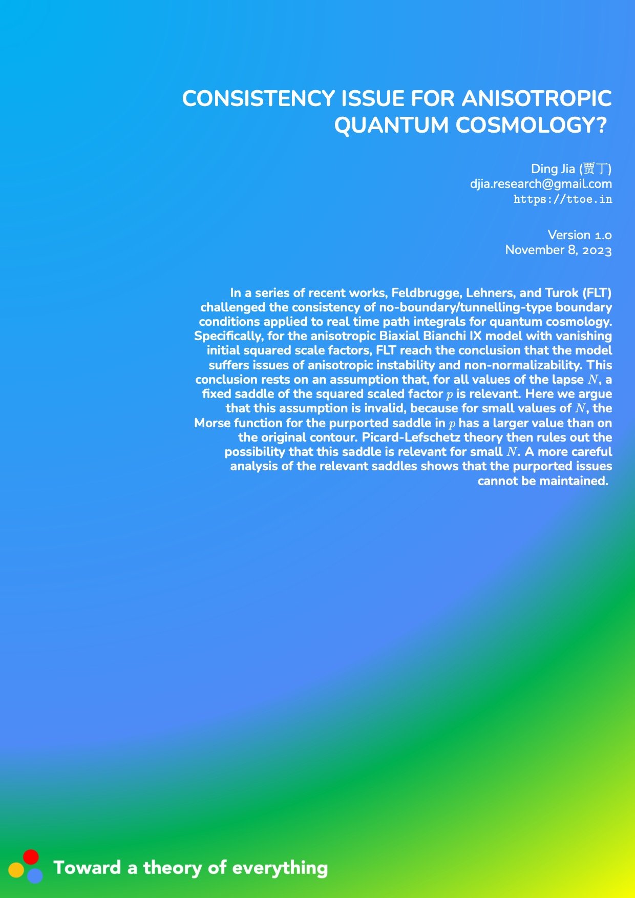 Abstract: In a series of recent works, Feldbrugge, Lehners, and Turok (FLT) challenged the consistency of no-boundary/tunnelling-type boundary conditions applied to real time path integrals for quantum cosmology. Specifically, for the anisotropic Biaxial Bianchi IX model with vanishing initial squared scale factors, FLT reach the conclusion that the model suffers issues of anisotropic instability and non-normalizability. This conclusion rests on an assumption that, for all values of the lapse N, a fixed saddle of the squared scaled factor p is relevant. Here we argue that this assumption is invalid, because for small values of N, the Morse function for the purported saddle in p has a larger value than on the original contour. Picard-Lefschetz theory then rules out the possibility that this saddle is relevant for small N. A more careful analysis of the relevant saddles shows that the purported issues cannot be maintained.