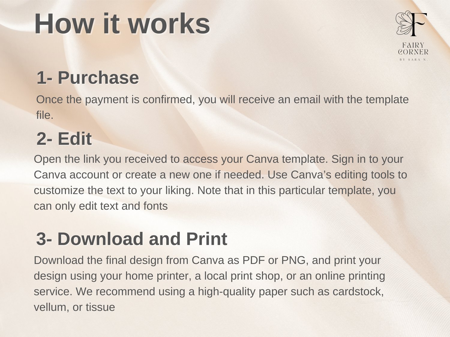 ✨Edit: Open the link you received to access your Canva template. Sign in to your Canva account or create a new one if needed. Use Canva’s editing tools to customize the text to your liking. NOTE that in this particular template, you can only edit text and fonts