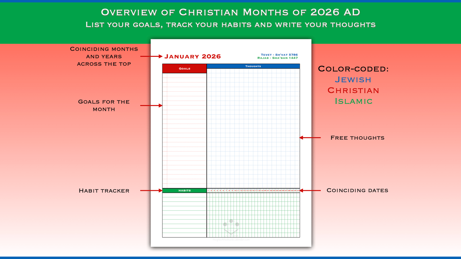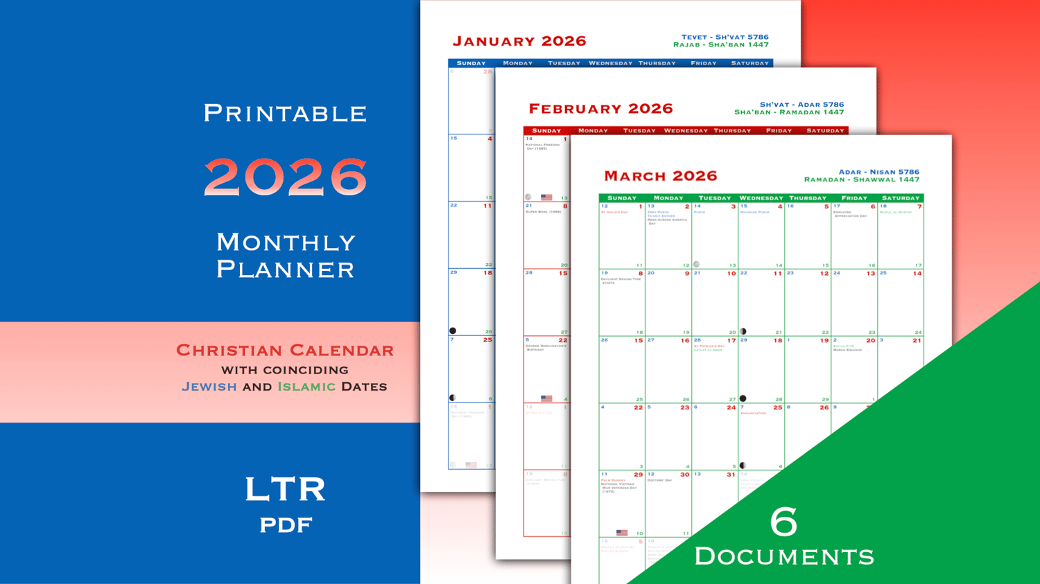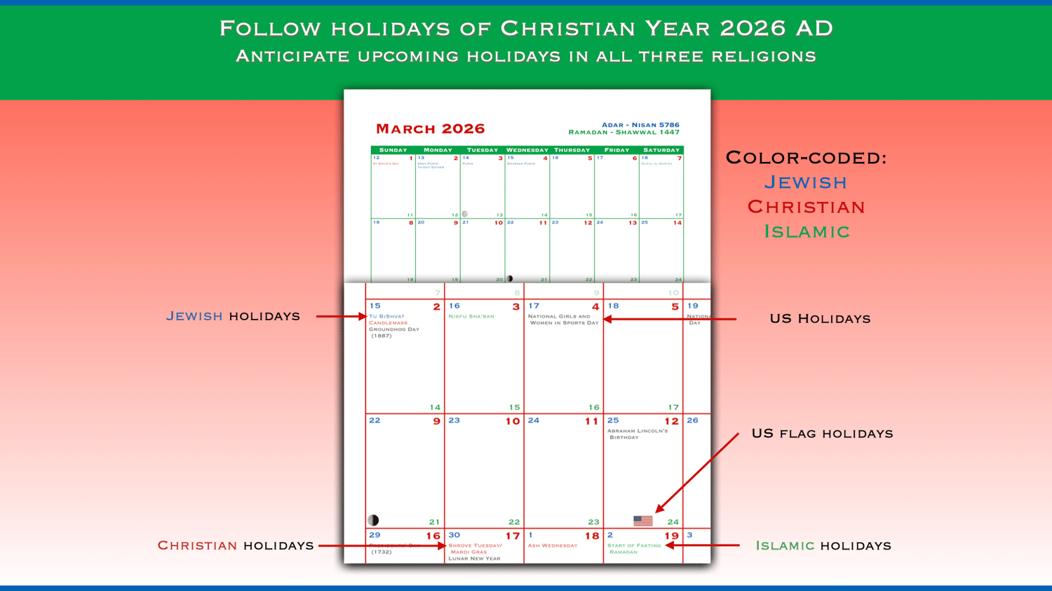 The Christian (Gregorian) calendar is used world-wide as the universal calendar for business, much like English is a universal business language. The Jewish and Islamic calendars are still in use today by members of those faiths and in certain countries. As a result, calendars combining one of these with the Gregorian calendar are readily available, but this calendar combines all three so we can all use the same one.