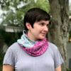 The Tunisian Zen Cowl is designed for a fingering weight yarn, but can easily be made in any weight by simply adjusting your hook size. The heavier the weight of yarn, the more plush your cowl will be! This pattern is worked flat, then seamed to create a cowl shape that will wrap twice around your neck and fit snugly. You can easily increase or decrease the length of your finished project by adding/subtracting pattern repeats. You can also forgo seaming altogether and make a scarf!