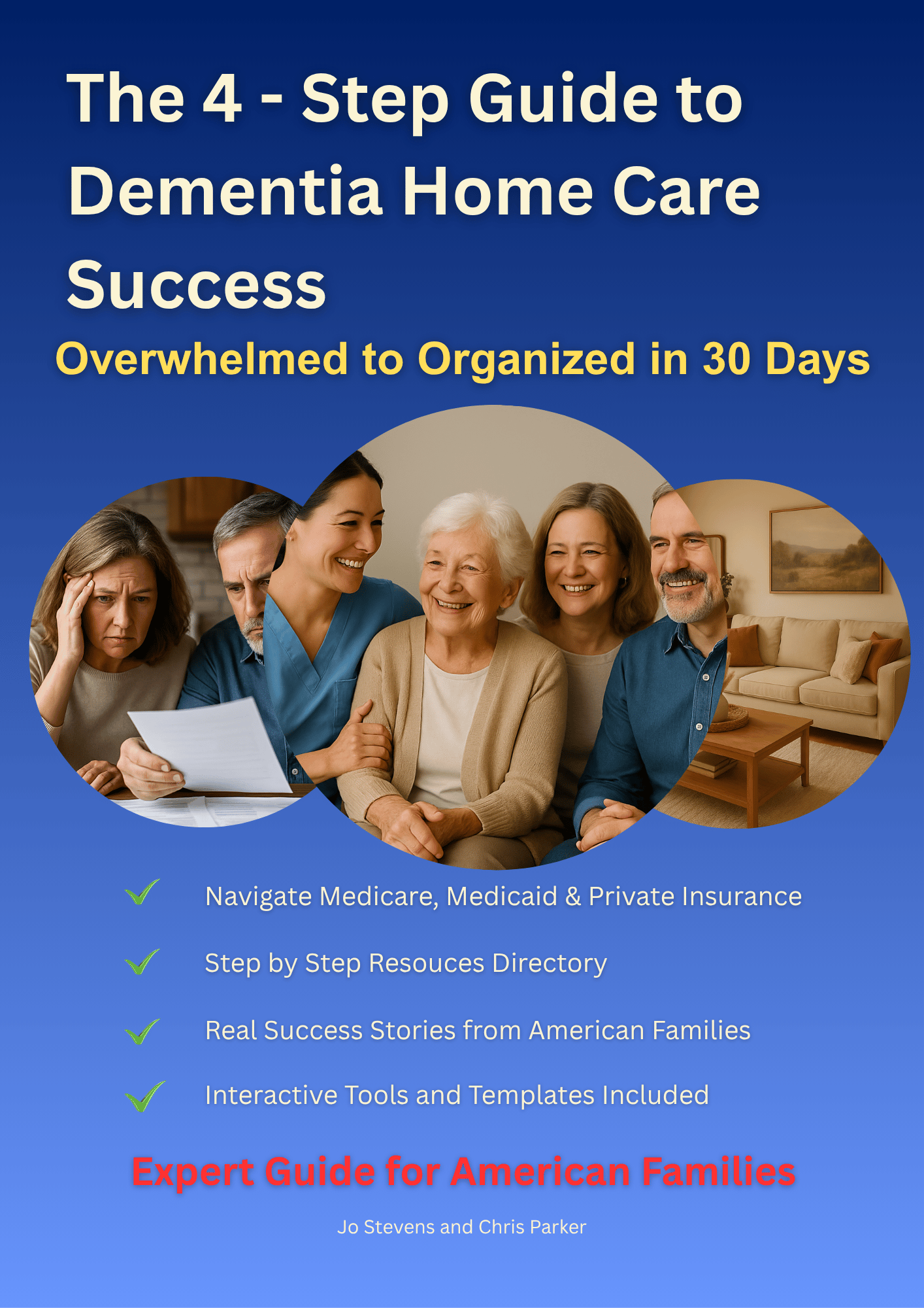 This is a comprehensive guide titled "The 4-Step Guide to Quality Dementia Home Care in the U.S." by Jo Stevens and Chris Parker. It's specifically designed to help American families navigate the complex U.S. healthcare system to secure professional, compassionate home care for loved ones with dementia.