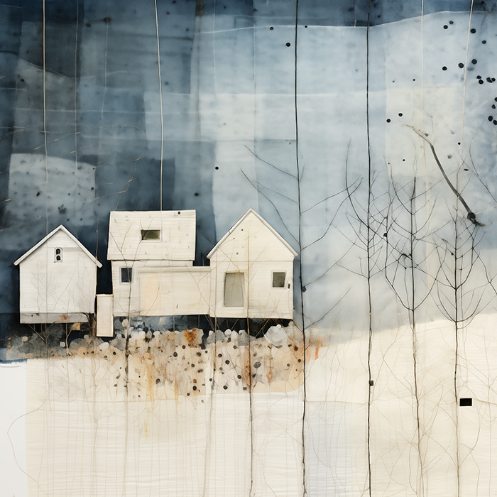 Three pale homes rest quietly against a deep blue sky, framed by bare winter trees. Still Houses captures the hush of snow and the calm of shelter, balancing architectural lines with delicate ink detail. A contemplative piece for modern, minimalist interiors.