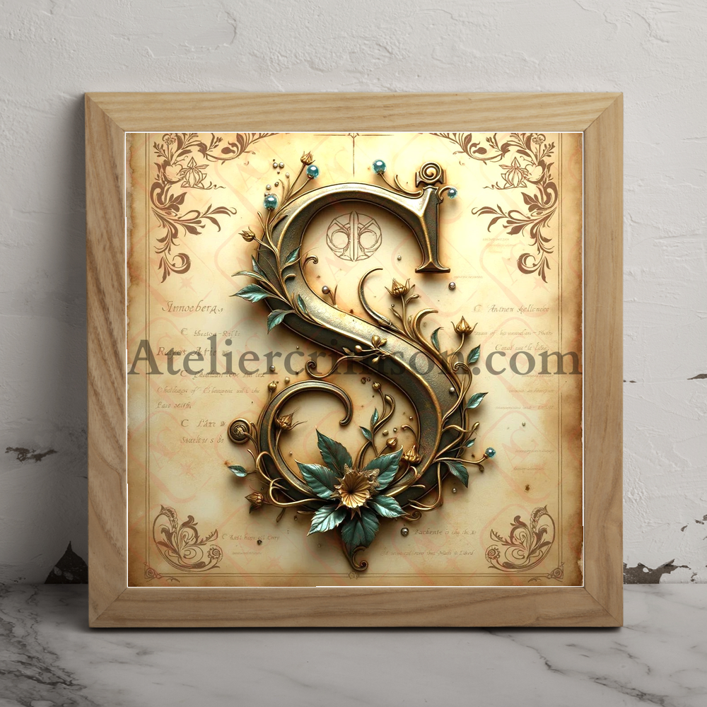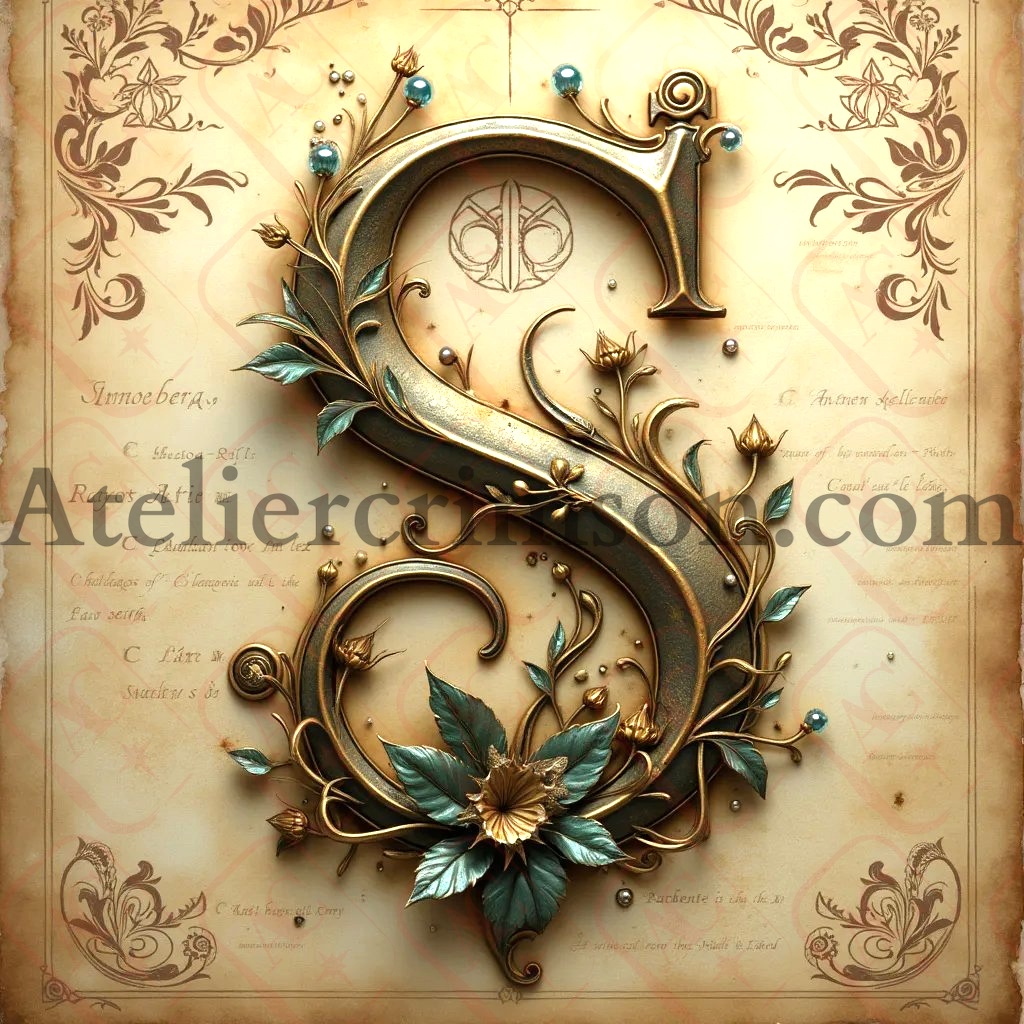 The letter S Art Nouveau alchemical Each character crafted as a stunning 3D brass sculpture with weathered patina, set against a mystical alchemical parchment. Ornate vines, floating bubbles, and antique gears create a magical shabby chic atmosphere. Perfect for vintage-inspired designs, book covers, or unique wall art."