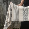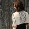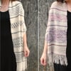 The One is a long, rectangular wrap. It features sections of linen stitch texture and sections of mosaic colourwork; each section is separated by a Latvian Braid.