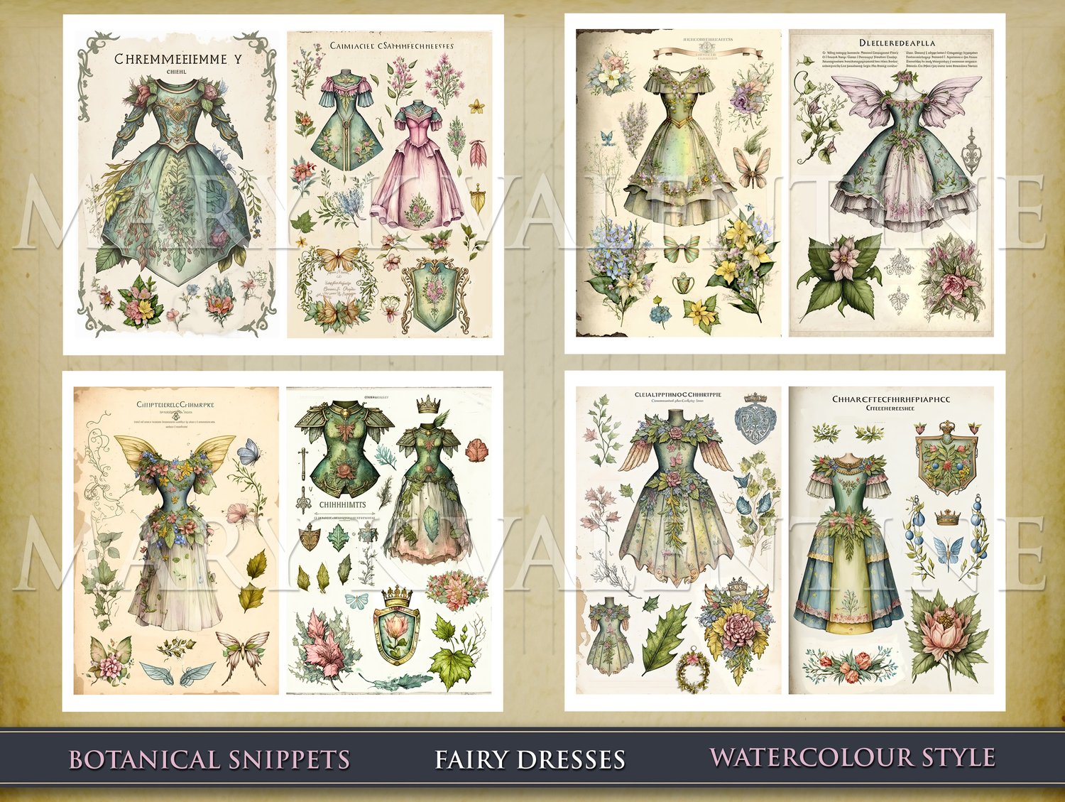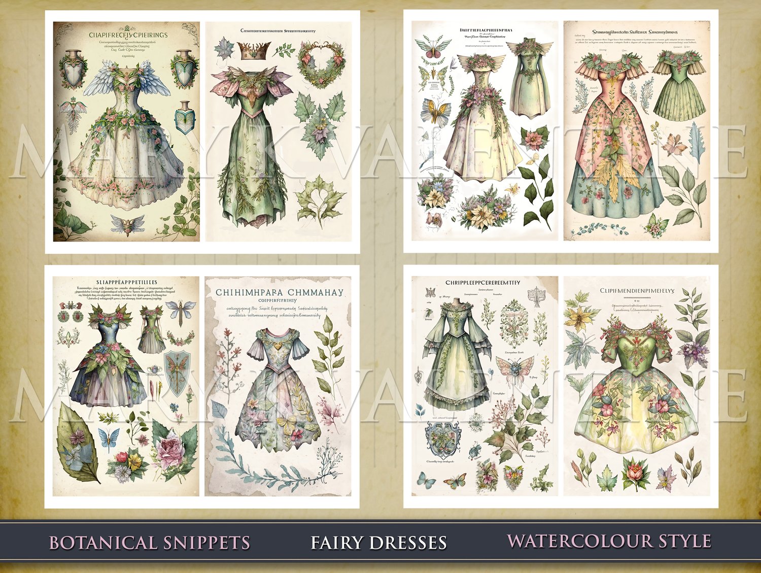 48 junk Journal pages full of watercolour fairy dresses and shoes. Pink, blue, white, green and lilac fairy wing dresses with flowers, foliage, crowns, butterflies and fairy French :-). Printable pages perfect for scrapbooking, art journals and craft projects. Includes A5 size dress pages plus sheets of smaller A6 pages for the shoes. Use them as full page designs or fussy cut individual items to add some unique details to your pages and paper crafts.
