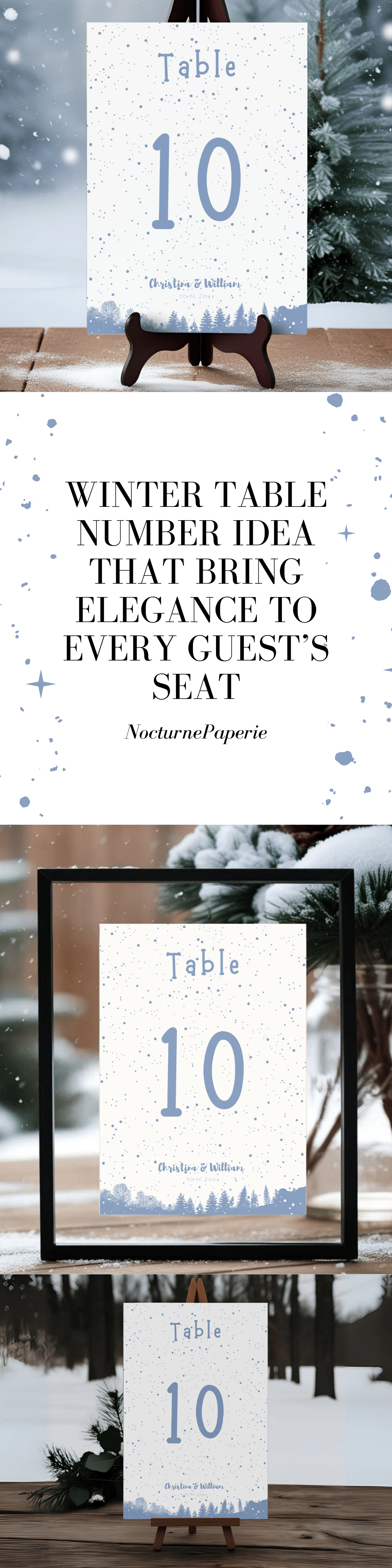 This winter wedding table number card features a printable design with an elegant, editable layout, perfect for reception dinners. It serves as a stylish table sign to guide guests to their seats while adding a seasonal touch to your wedding decor. It’s part of our seasonal collection on NocturnePaperie—explore other seasons like Summer, Spring, and Autumn.