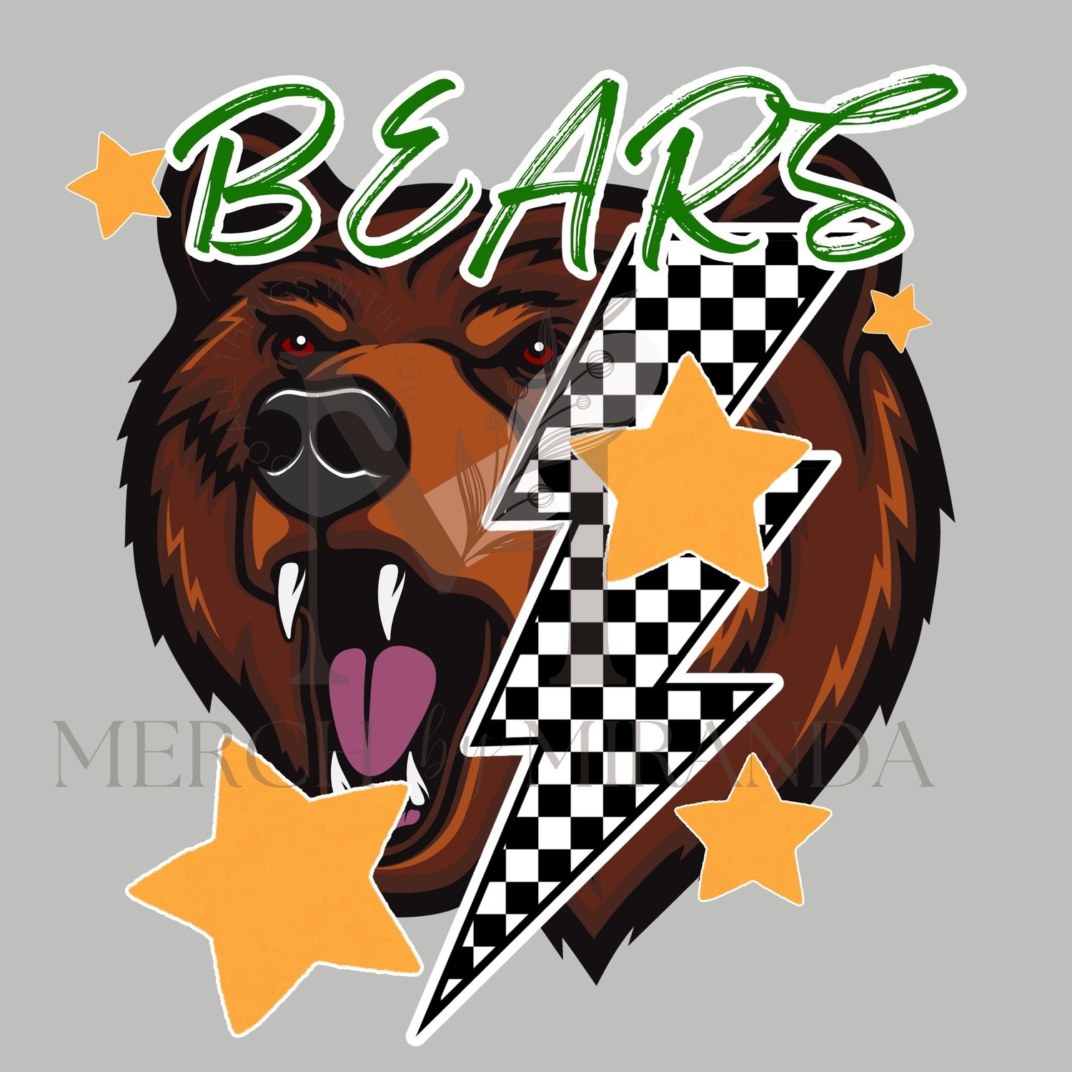 Bear Mascot Green and Gold | Sublimation Design | Digital Download | School Spirit Shirt PNG | DTF Design | Lightning Bolt-Checkered with Stars - Bears