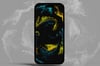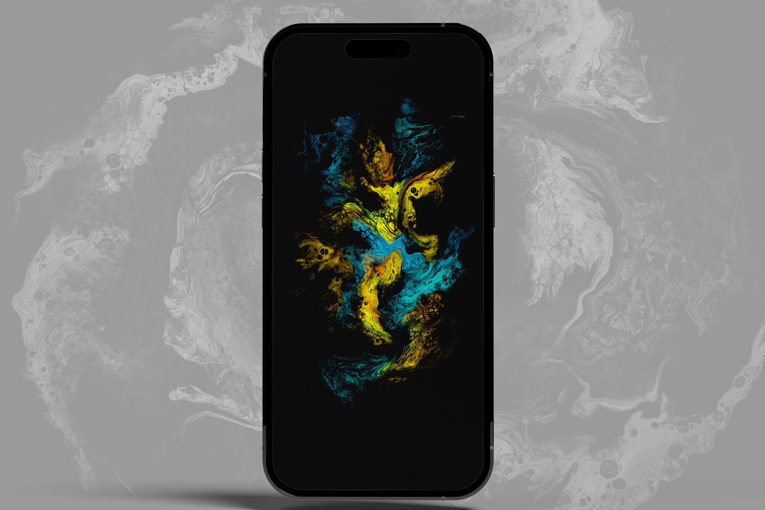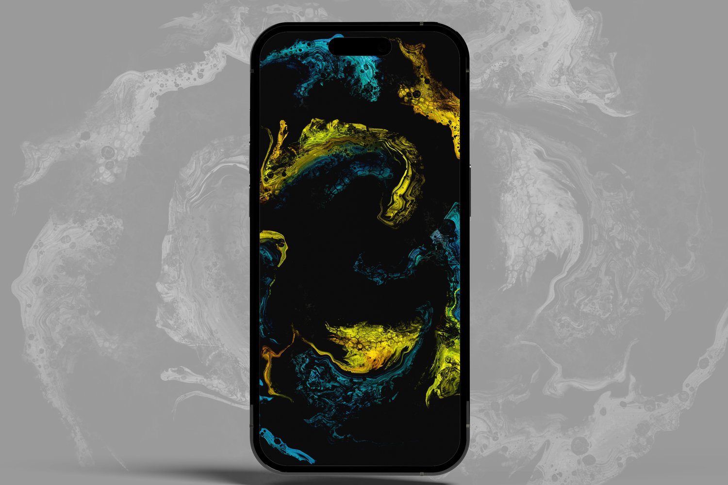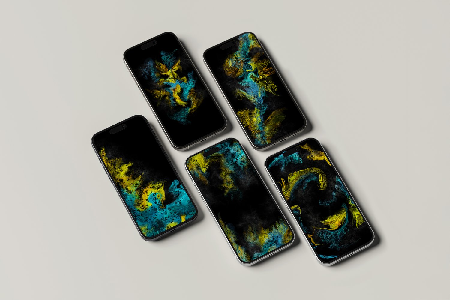 5 bold and colourful abstract wallpapers in an acrylic paint pour art style with a strong blue & yellow colour scheme.