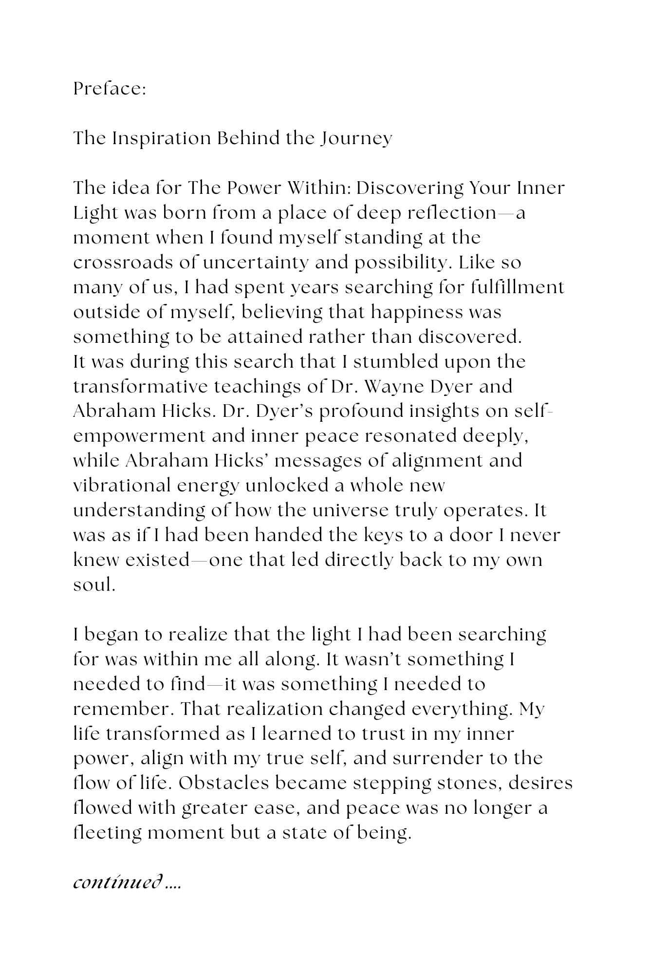 Are you ready to transform your life, connect with your higher self, and uncover your true purpose? "The Power Within: Discovering Your Inner Light" is a powerful spiritual self-help eBook designed to help you tap into your inner strength, awaken your soul, and begin your journey to purposeful, intentional living.