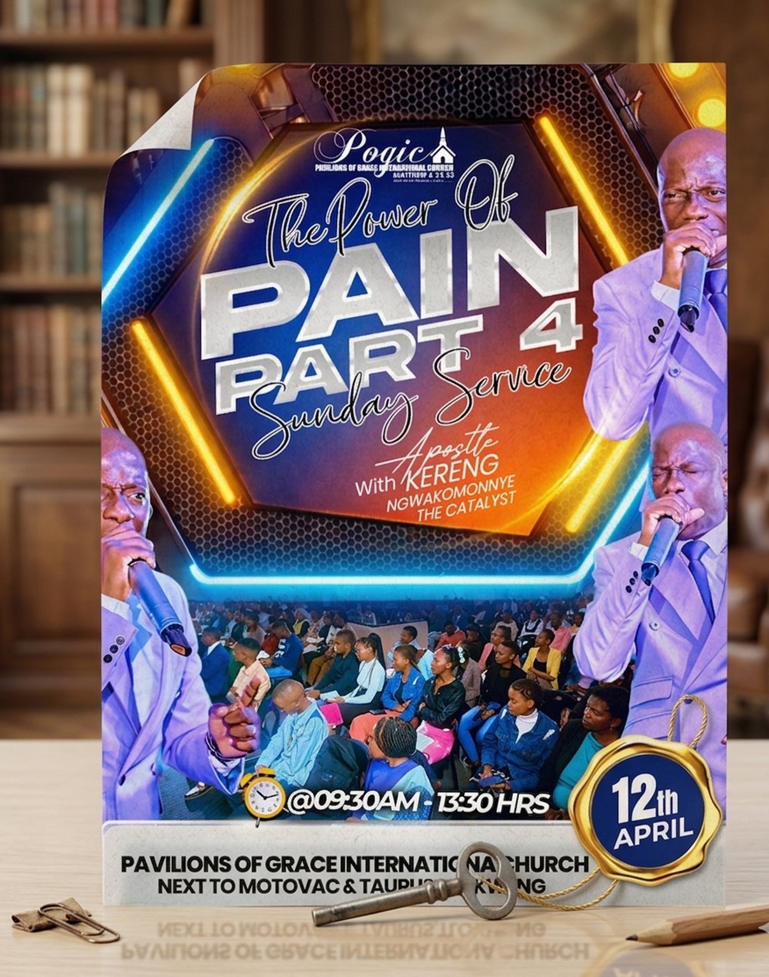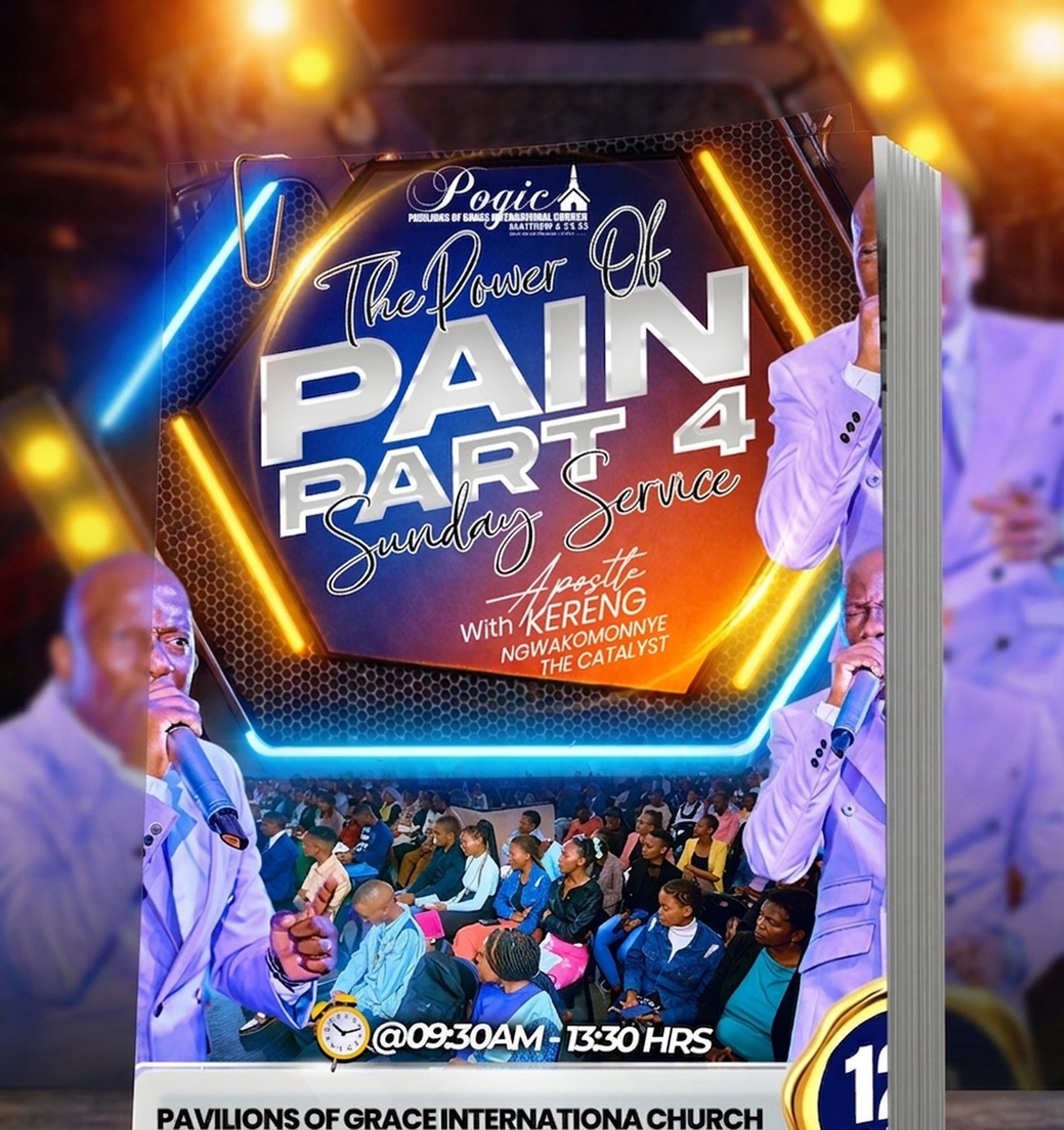 The design has a modern gospel aesthetic — energetic, welcoming, and spiritual. The mix of gold, yellow, and green gives it a vibrant and divine feel, fitting for a Sunday worship invitation.