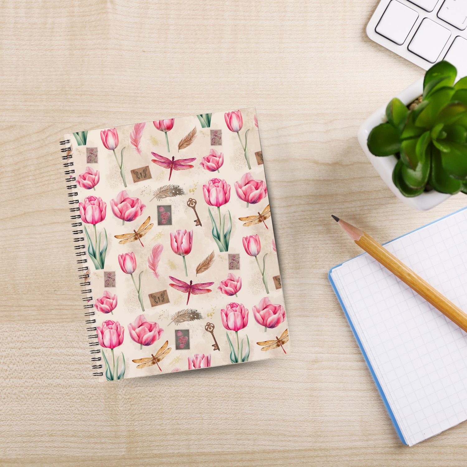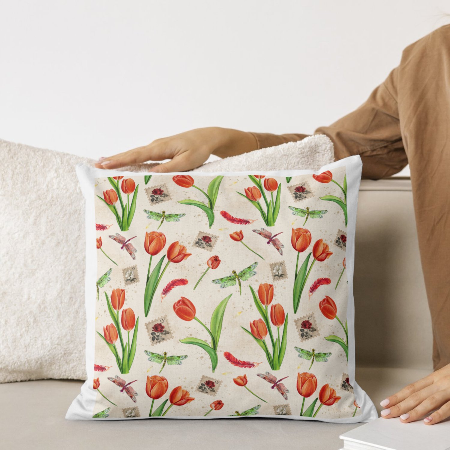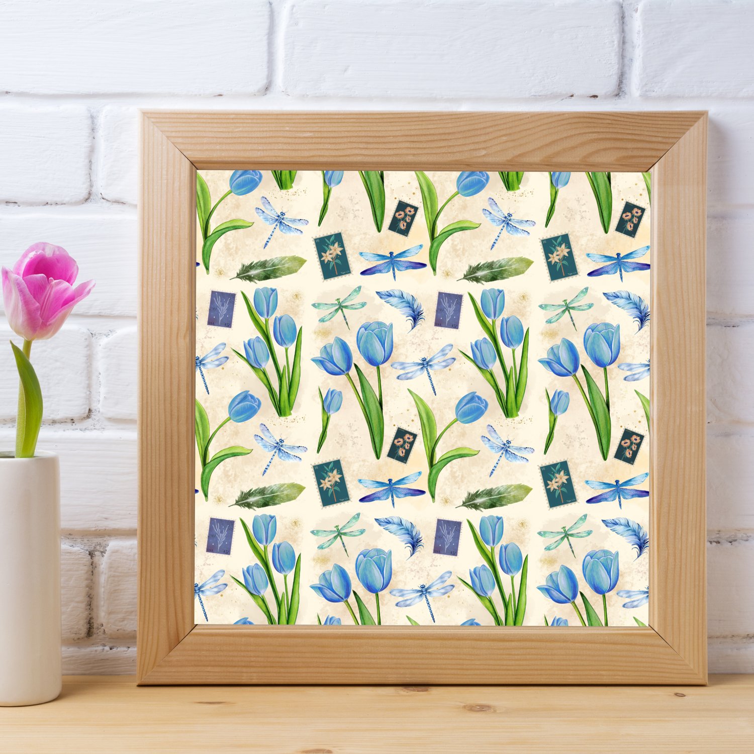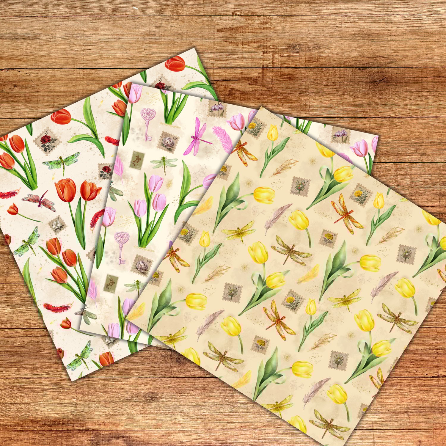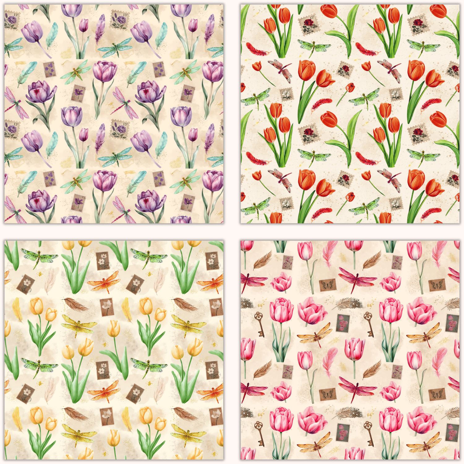 Step into a world of soft vintage florals with this seamless pattern collection featuring watercolor tulips in gentle, romantic tones. Each design is thoughtfully composed with added details like fluttering dragonflies, faded postal stamps, and airy feathers to evoke a sense of nostalgia and quiet elegance.