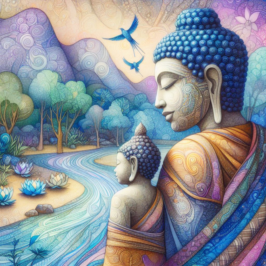 Buddha & child wearing colourful robes beside a beautiful winding river with flowers, trees, mountains & humming birds.
