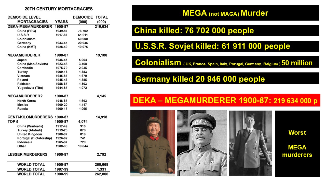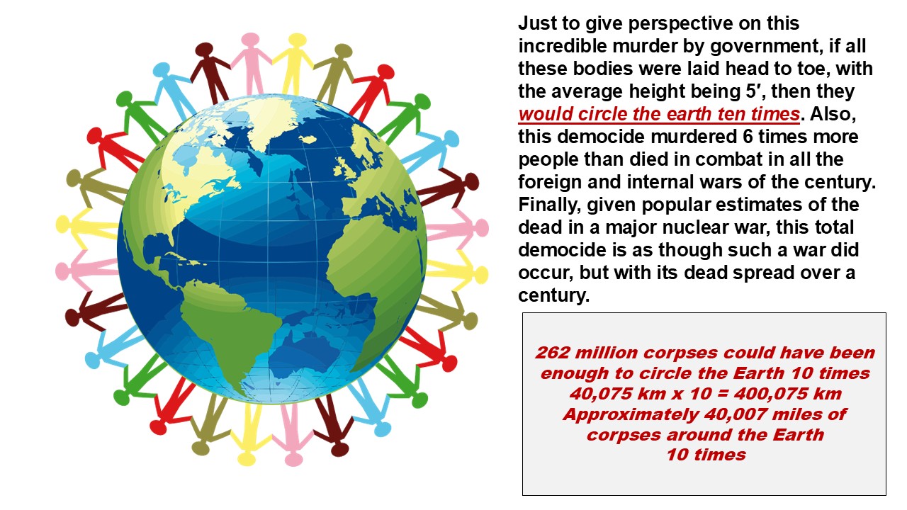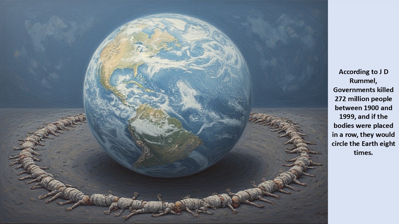 According to J D Rummel, Governments killed 272 million people between 1900 and 1999 and if the bodies were placed in a row they would have circled the Earth eight times. Dictatorships are a criminal and dangerous business that commits crimes against humanity. 75% of murders occur in countries ruled as Dictatorships. Today's Dictators should be considered murderers and if they can disappear, the Earth will be a safer place.