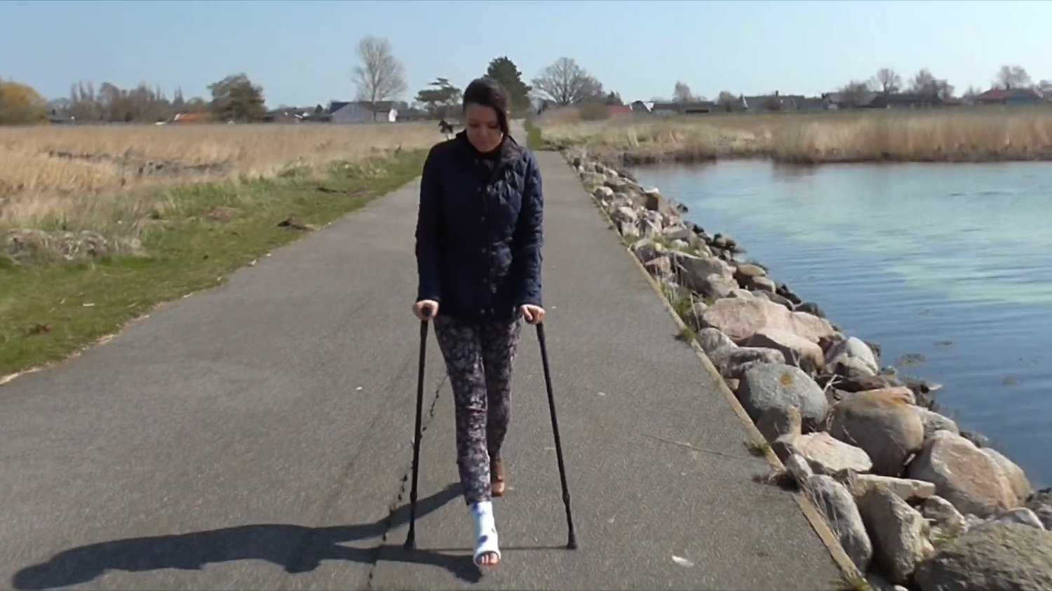 Midnight crutch down to the sea and we get some great closeup of her short leg cast on the way.She comes down to the bathing jetty but she think the jetty can be a little slippery so she leave her crutches and jump out on it on one leg