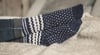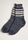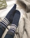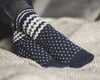 The socks are worked from the cuff down, with a colorwork motif at the leg, and small colorwork dots at the bottom of the leg and throughout the foot. The socks are worked with a slip stitch gusset heel and classic wedge toes, which are then closed by grafting top and bottom stitches together.