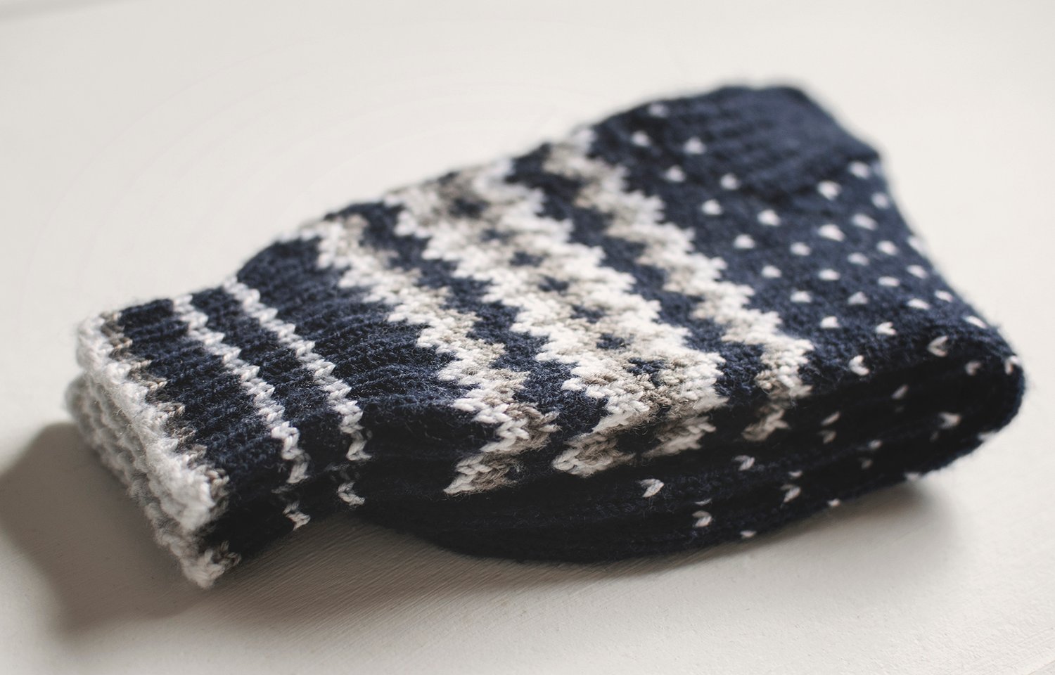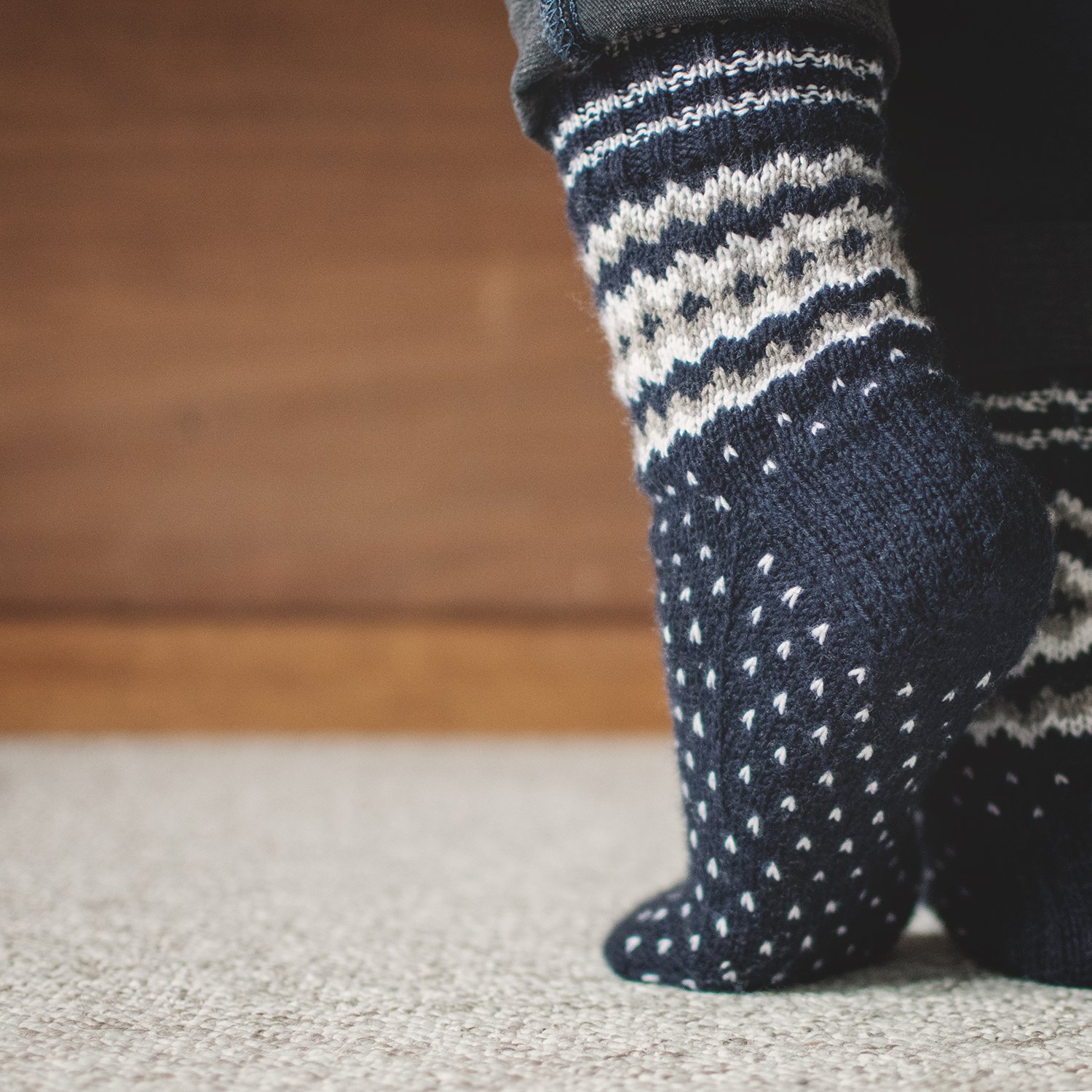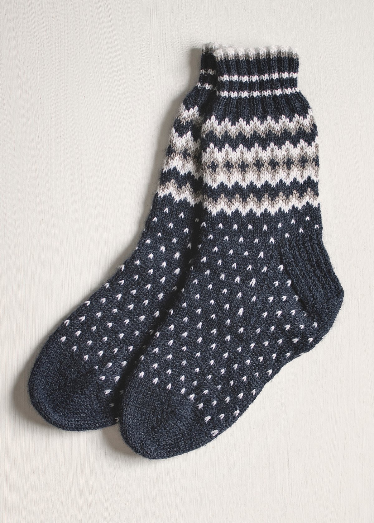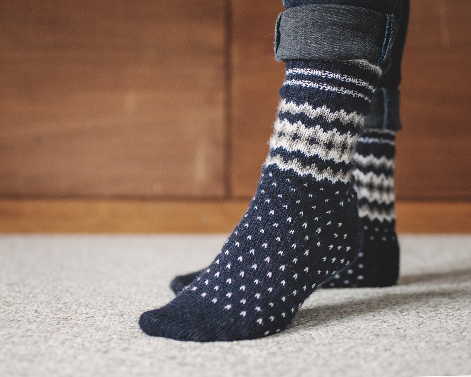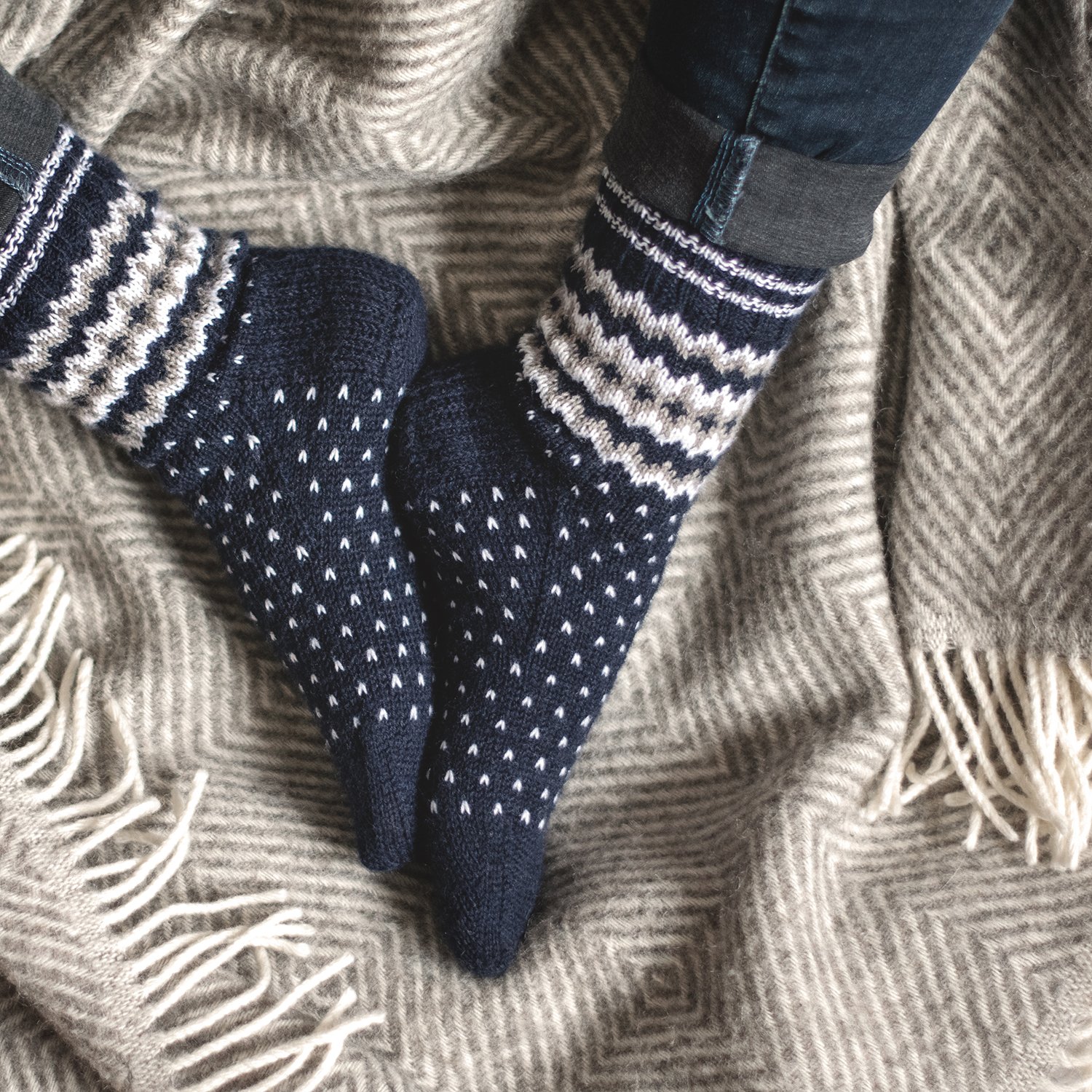 The construction is very suitable for beginners, and the colorwork pattern keeps it interesting for more advanced knitters. You will be rewarded with a beautiful pair of handmade socks, that keep your feet warm and cozy.