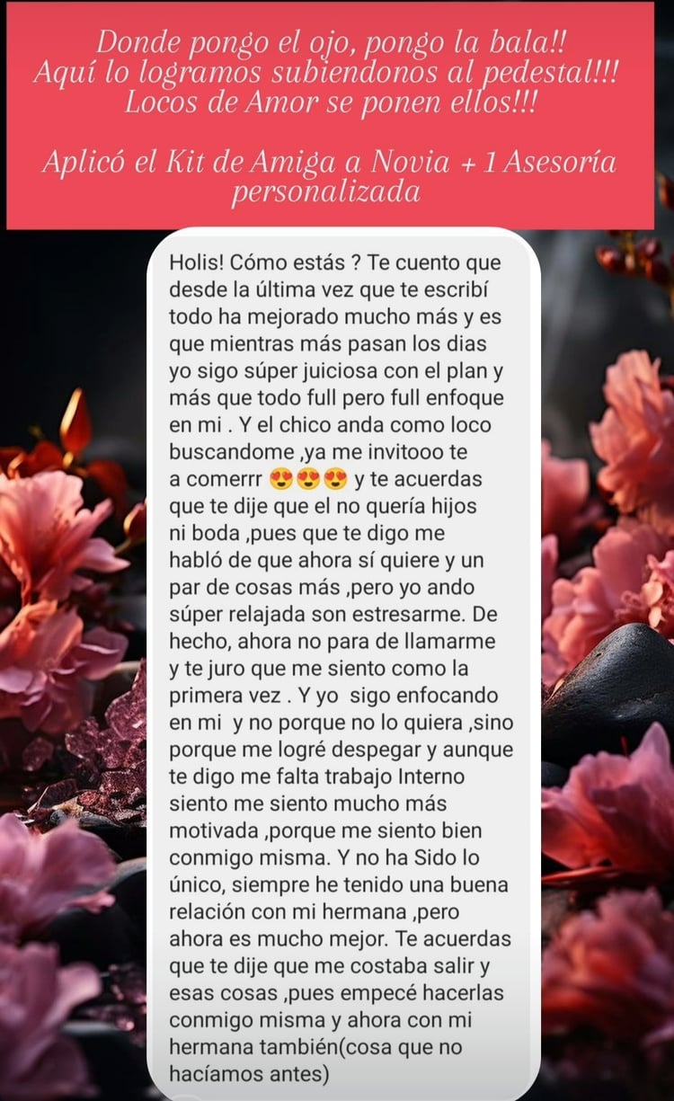 Este Kit te ayudará a reconectar contigo misma, a reconocer lo que realmente mereces, a ser una versión de ti Elegida, serás una versión de ti Magnética, Segura y que sabe lo que quiere. El Manual y los Audios te prepararán para que él te ruegue por una relación, porque te subirás tanto a tu pedestal que te volverás irresistible. Si aplicas la Estrategia que explico en el Manual, tienes más probabilidades de que cambien los papeles a tu favor y él te pida tener un noviazgo, que si no haces nada.