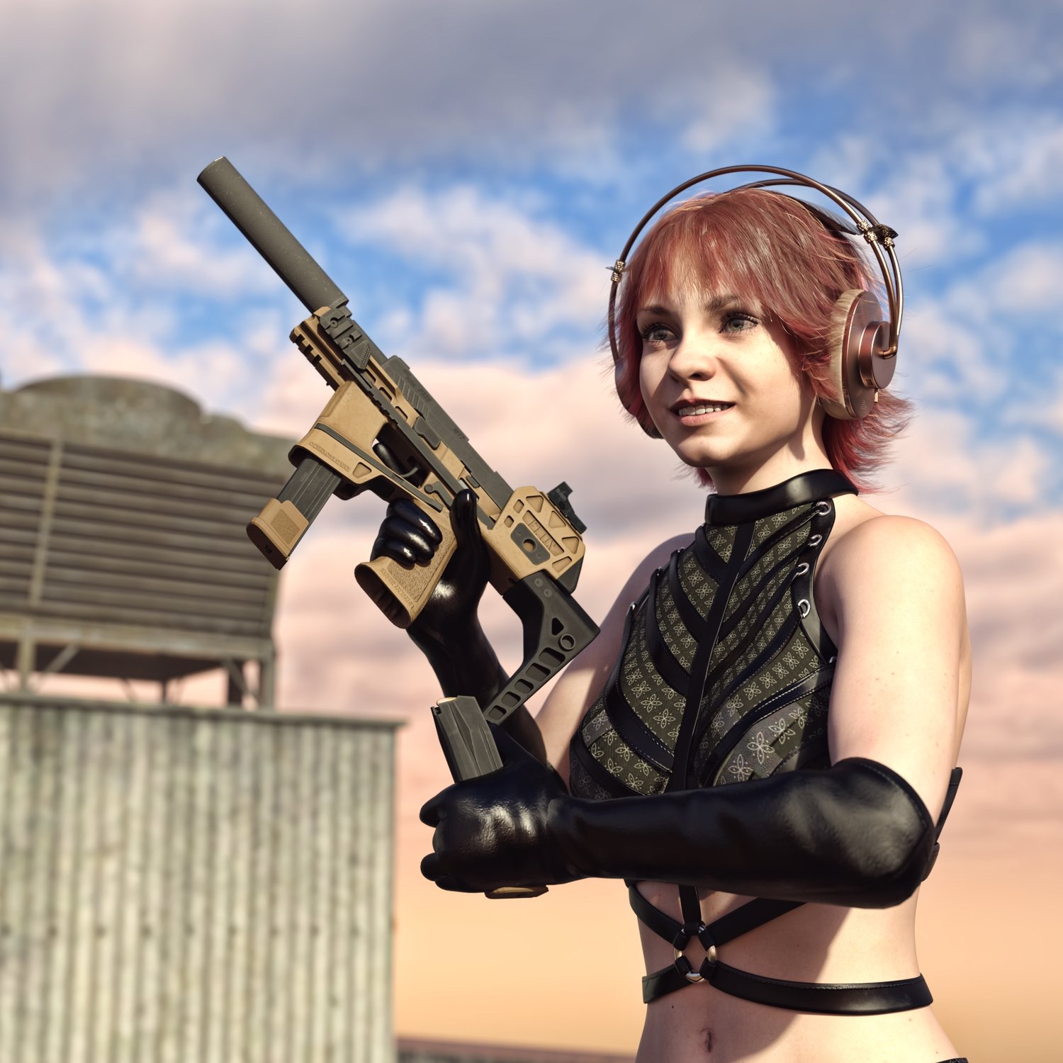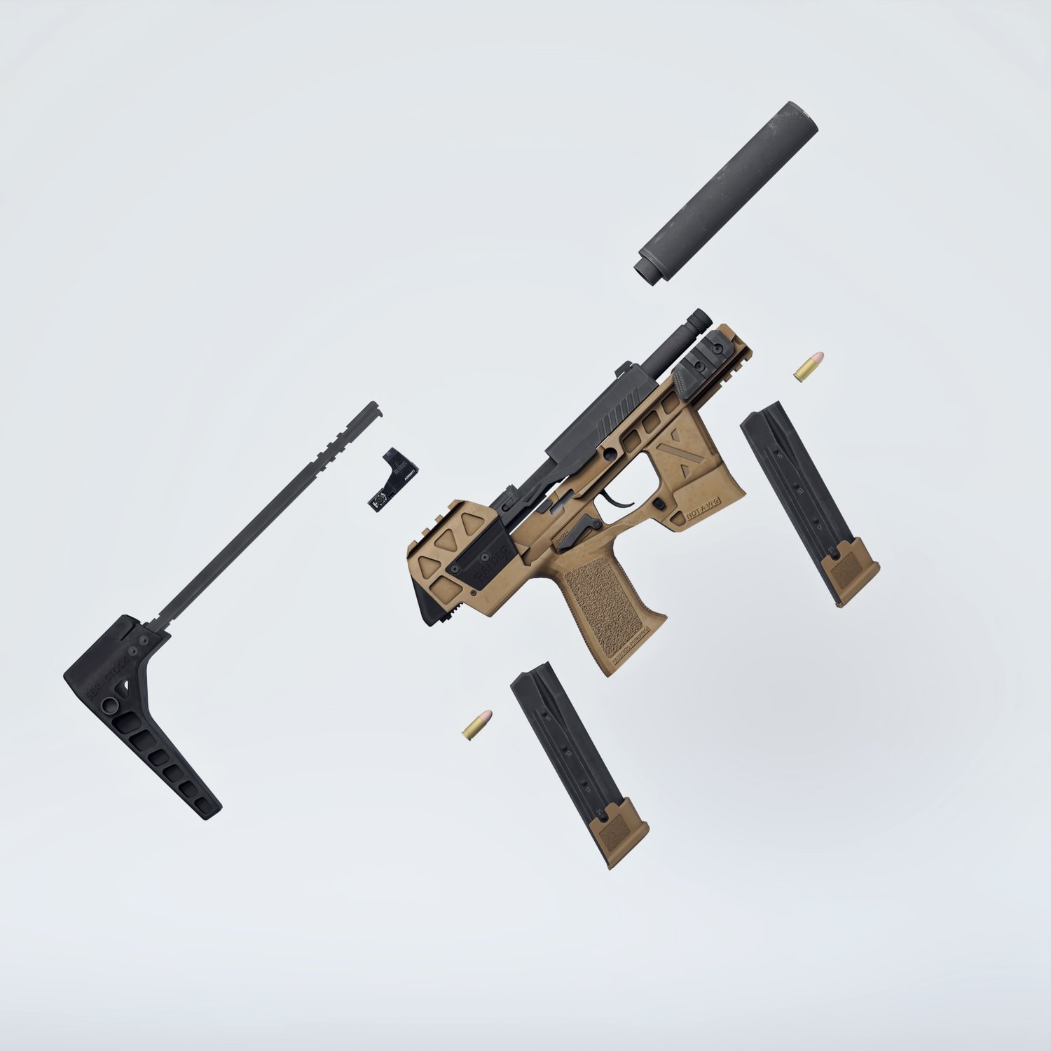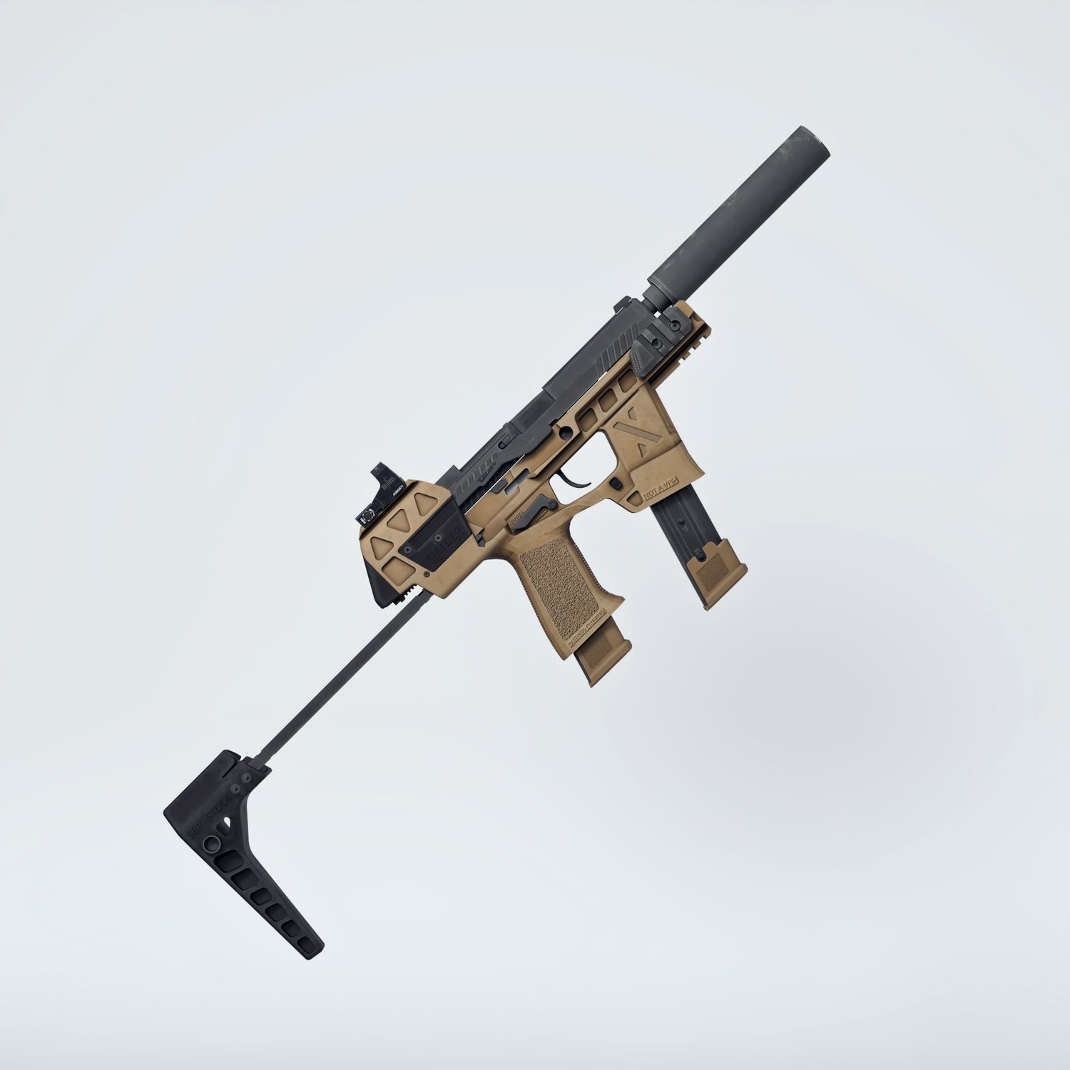 When you need a more stable platform in pistol caliber. Longer and more comfortable platform includes a stock to helps to mitigate the recoil, longer mag for more fire power, a red dot, a silencer and a spare mag. Converted and rigged for use in Daz, so you can make more realistic pictures, with moving slide, pulled trigger etc. Provides a great shooting experience in a comfortable compact package.