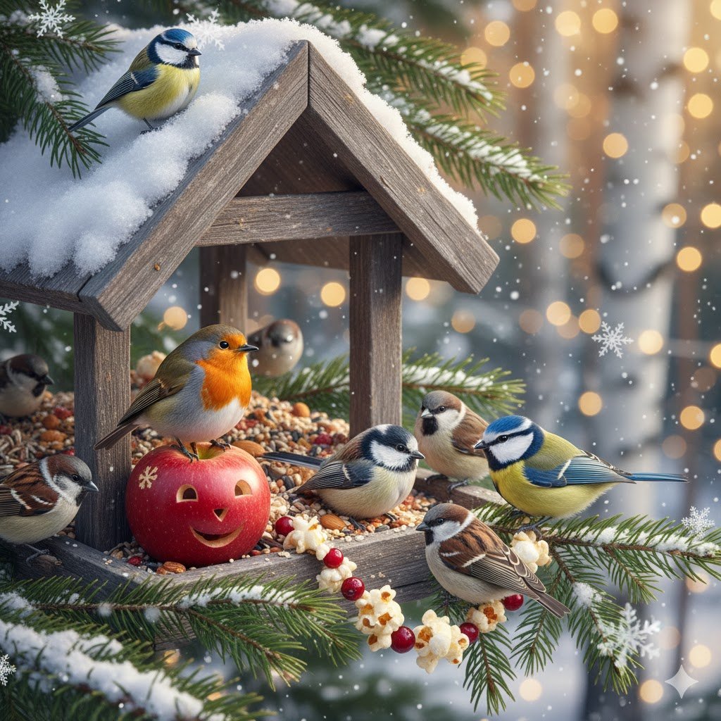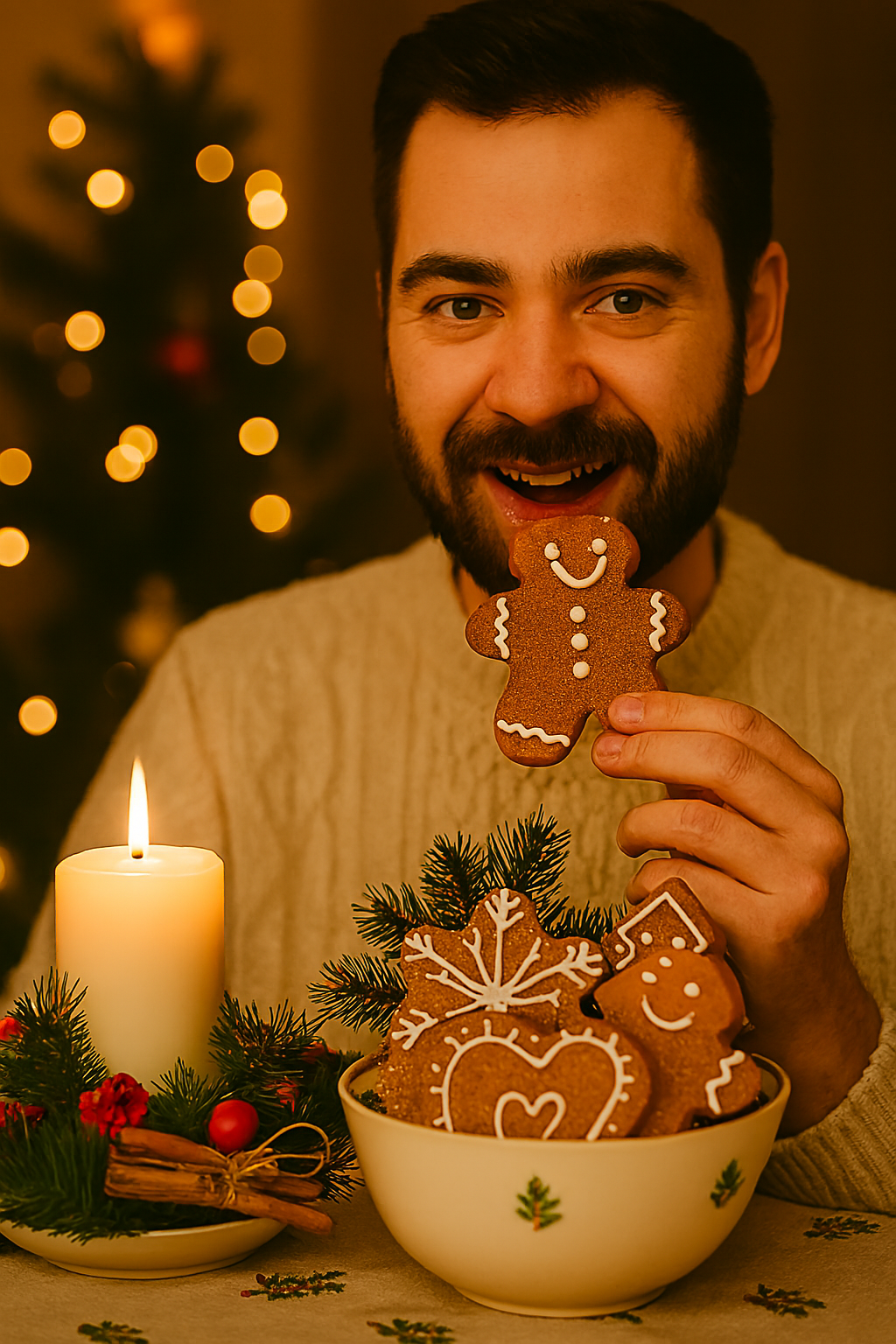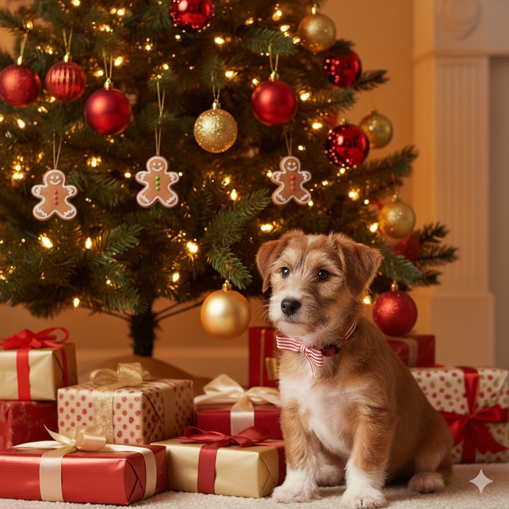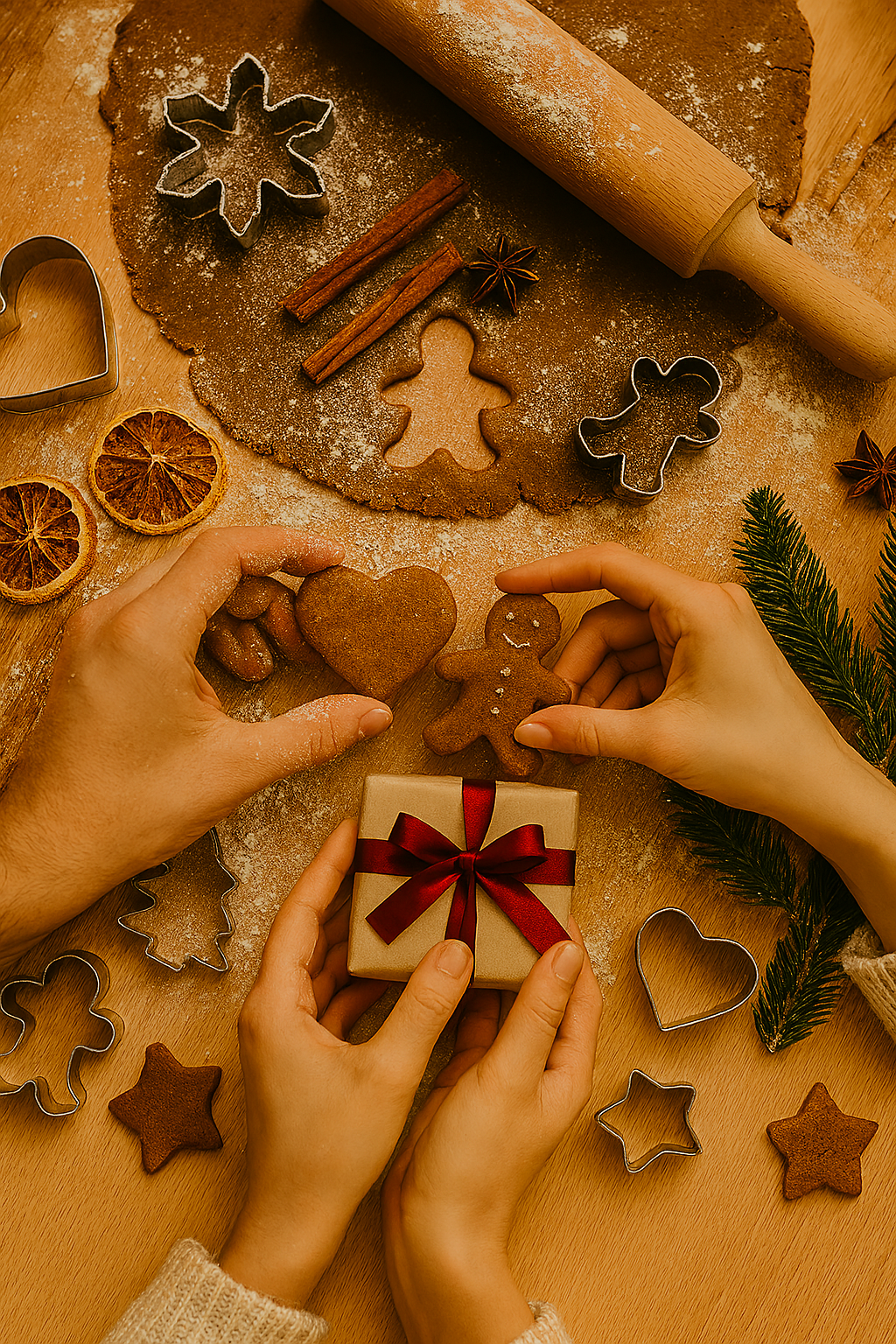 A festive photo series capturing warm holiday traditions, including lighting an Advent candle, hanging wreaths, decorating the Christmas tree, and exchanging gifts. The images feature cozy sweaters, evergreen elements, red and gold ornaments, and joyful expressions, creating a heartfelt Christmas atmosphere.