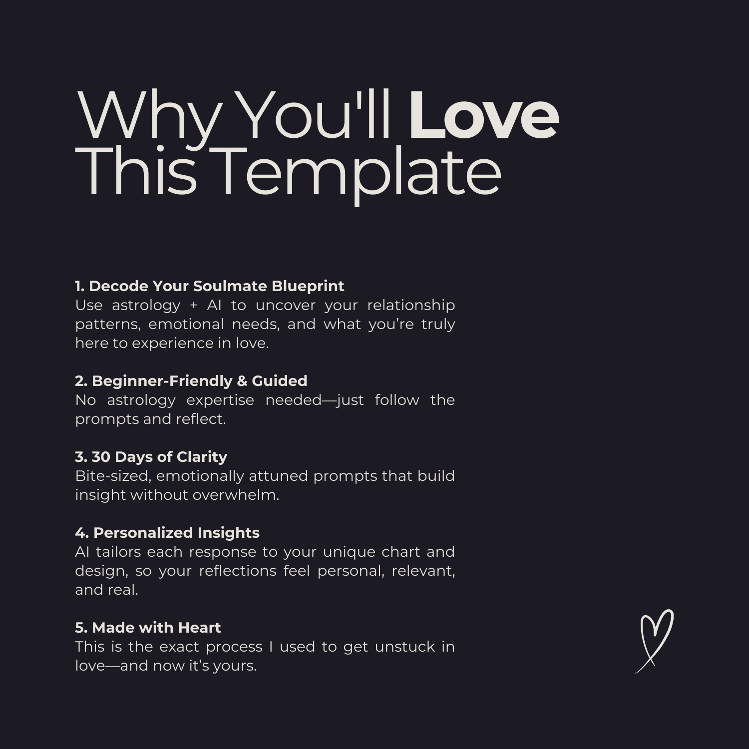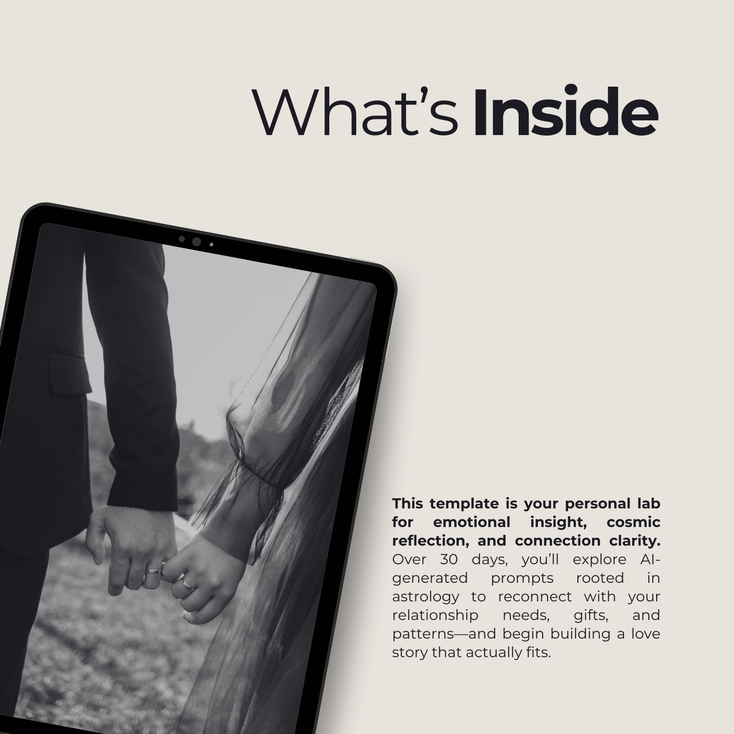 This template is your personal lab for emotional insight, cosmic reflection, and connection clarity. Over 30 days, you’ll explore AI-generated prompts rooted in astrology to reconnect with your relationship needs, gifts, and patterns—and begin building a love story that actually fits.