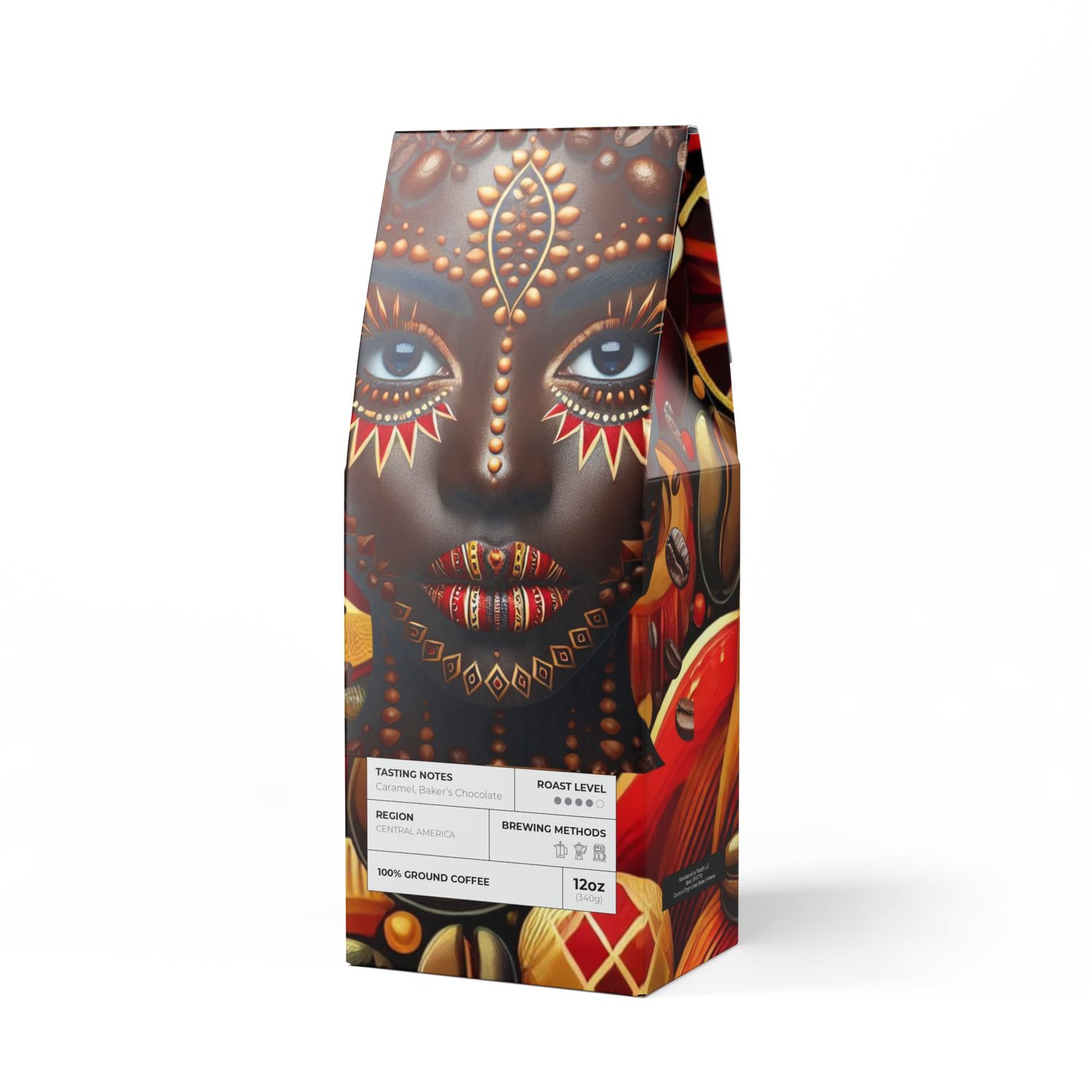 Awaken your senses with the bold, rich flavors of Mocha Essence Coffee. Infused with hints of caramel, baker's chocolate, and earthy undertones, this 100% ground coffee is sourced from the finest Central American regions. Its unique roast profile delivers a smooth, robust cup with vibrant aromatics to elevate your coffee experience. Perfectly encapsulated in a visually stunning package inspired by Afrocentric art, Mocha Essence Coffee celebrates culture, flavor, and artistry in every sip. Brew your essence and indulge in the extraordinary.