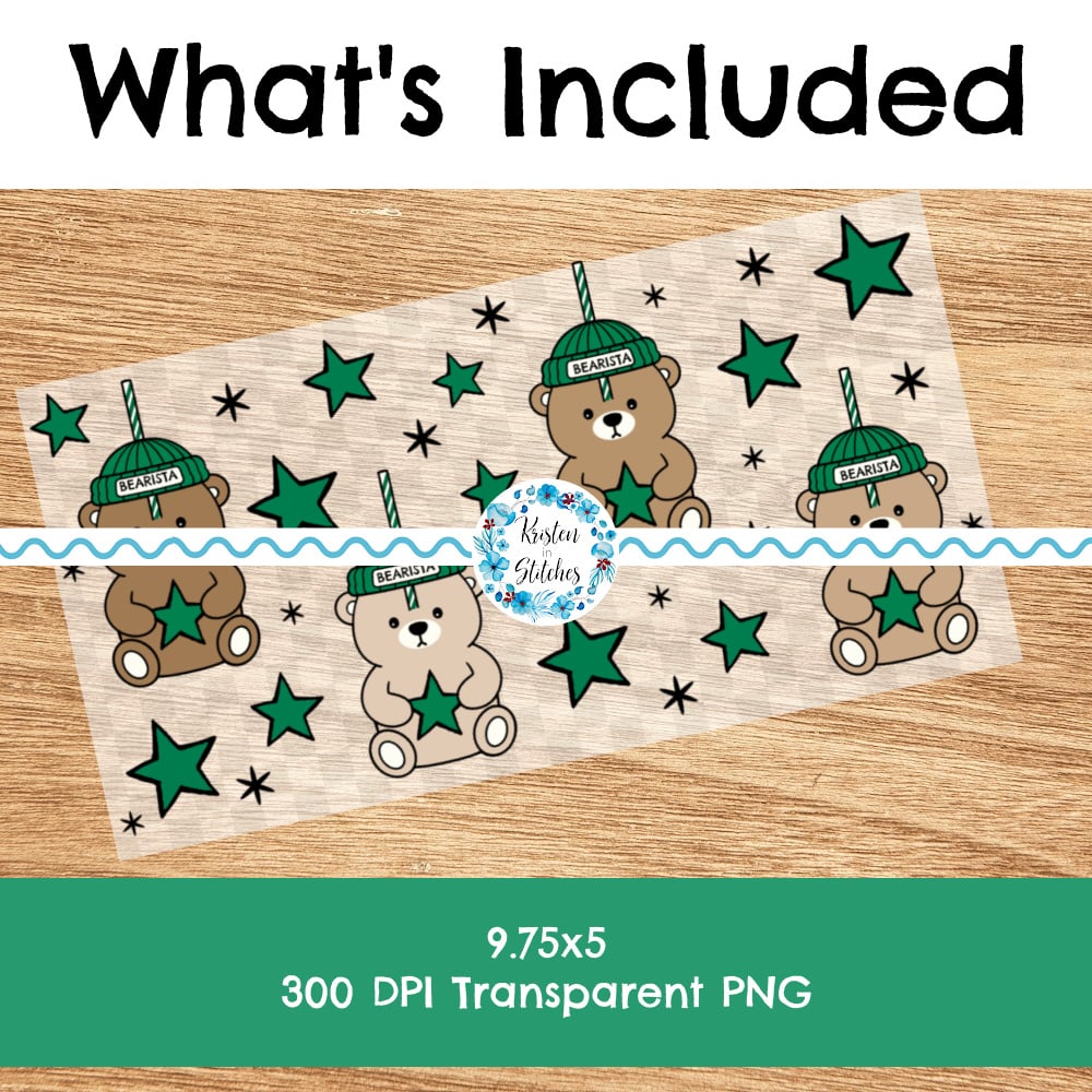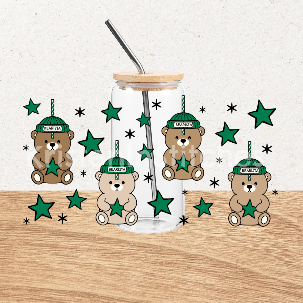 Features barista teddy bear straw cups and green stars.
