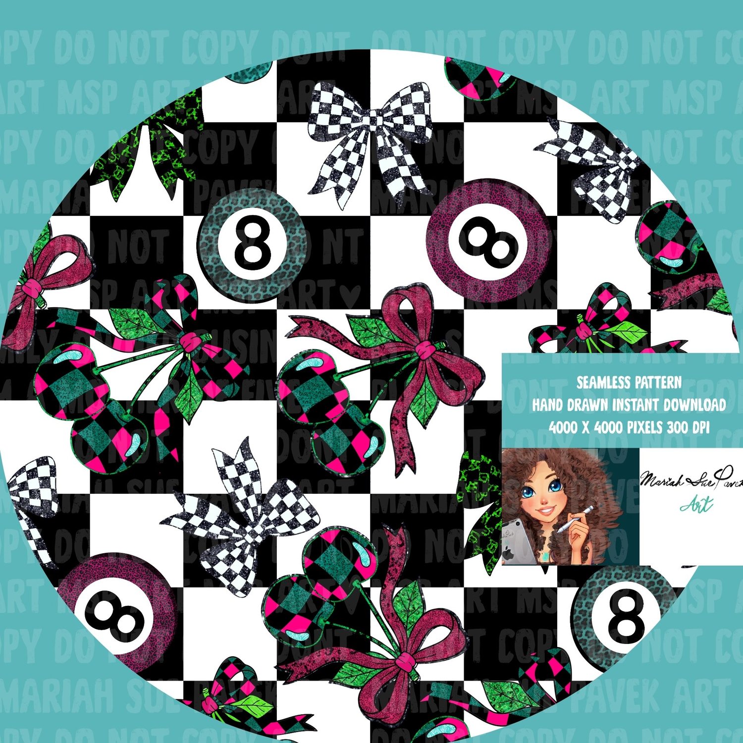 Neon Chaos Neon Animal Print Black & White Checkered Seamless Pattern | Maximalist Bow Eight Ball Design | Glam Retro Seamless