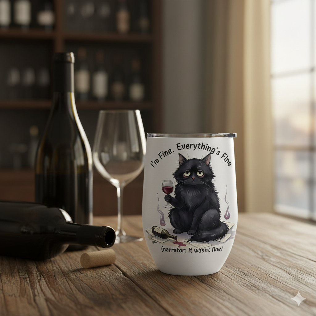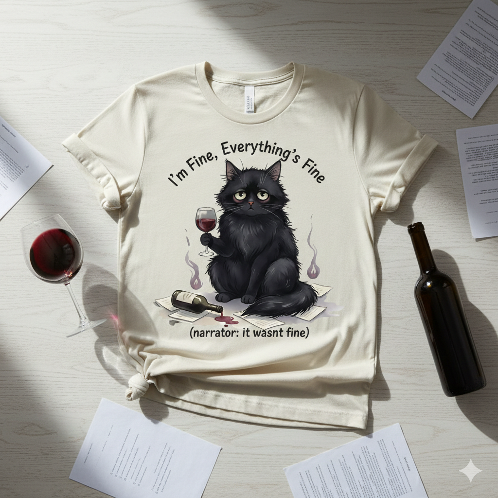 This hilarious watercolor black cat design perfectly captures that "barely holding it together" energy we all know too well! Featuring a fluffy black cat sipping wine while everything falls apart, with the relatable sarcastic quote "I'm Fine, Everything's Fine (narrator: it wasn't fine)."