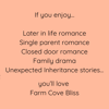 Farm Cove Bliss is a small town sweet romance. If you like small town settings, relatable characters, and mid-life love, you’ll adore E.D. Hackett’s Farm Cove Bliss.