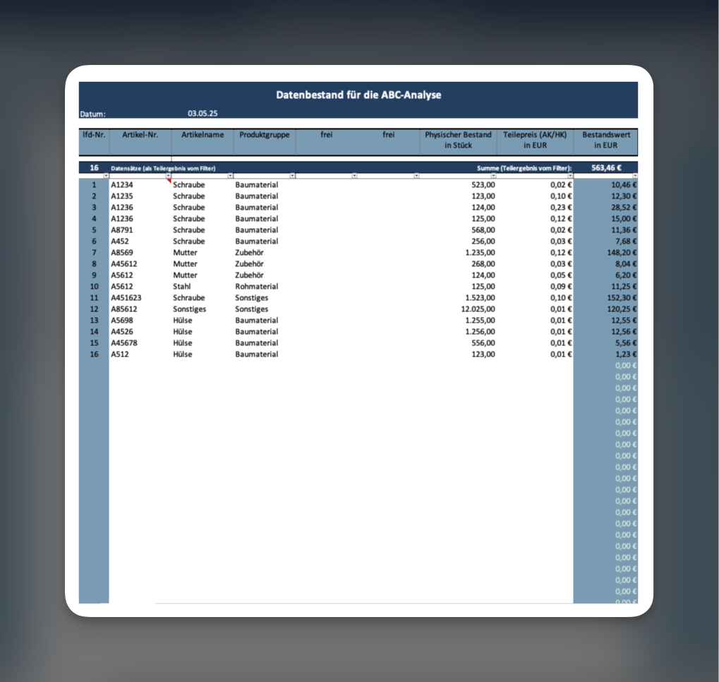 In dieser offen editierbaren Excel-Datei findest du ein praxisbewährtes ABC-Analyse-Tool zur Bewertung deiner Artikel, Kunden oder Aufgaben nach Relevanz.