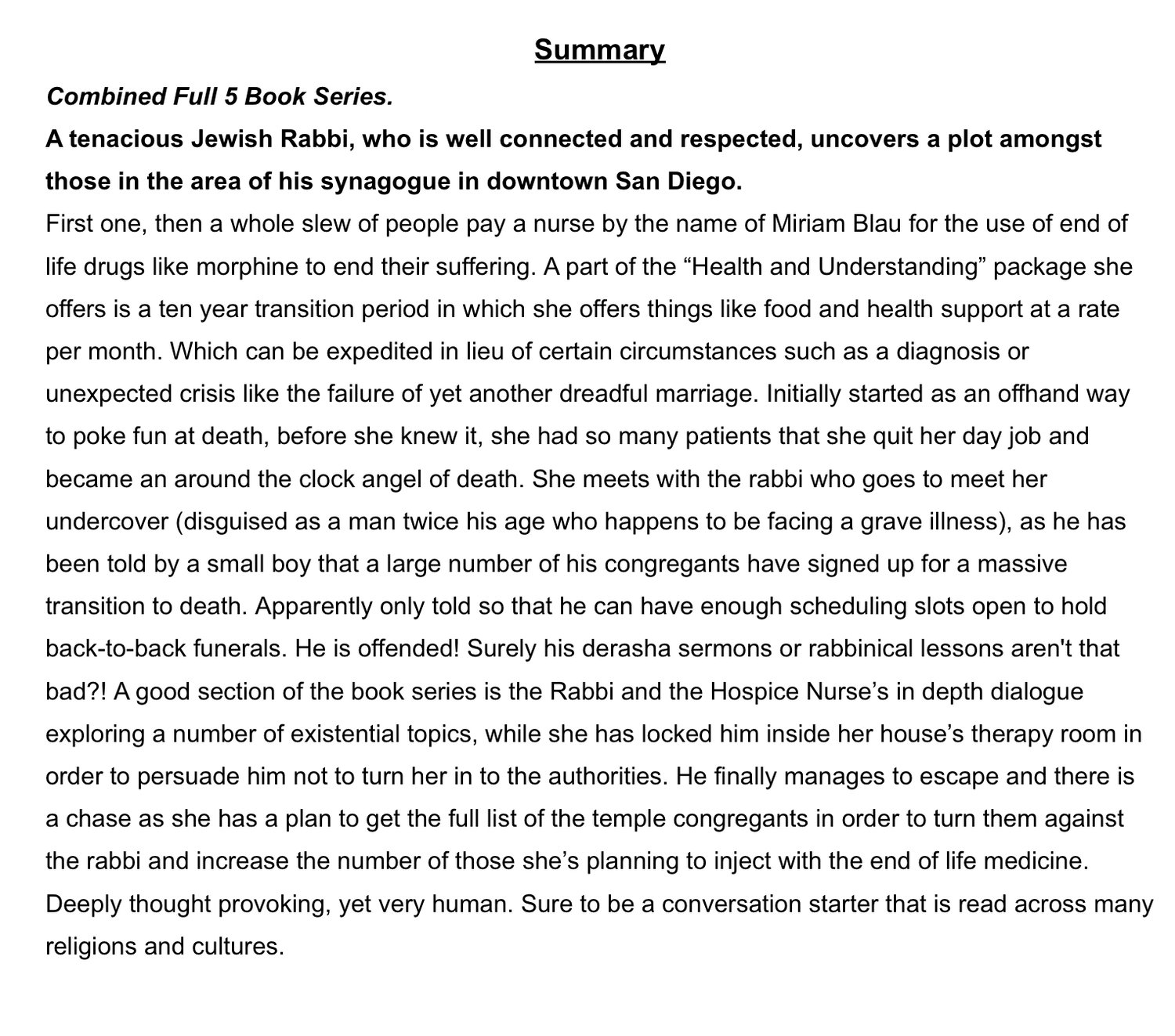 First one, then a whole slew of people pay a nurse by the name of Miriam Blau for the use of end of life drugs like morphine to end their suffering. A part of the “Health and Understanding” package she offers is a ten year transition period in which she offers things like food and health support at a rate per month. Which can be expedited in lieu of certain circumstances such as a diagnosis or unexpected crisis like the failure of yet another dreadful marriage. Initially started as an offhand way to poke fun at death, before she knew it, she had so many patients that she quit her day job and became an around the clock angel of death. She meets with the rabbi who goes to meet her undercover (disguised as a man twice his age who happens to be facing a grave illness), as he has been told by a small boy that a large number of his congregants have signed up for a massive transition to death. Apparently only told so that he can have enough scheduling slots open to hold back-to-back funerals. He is offended! Surely his derasha sermons or rabbinical lessons aren't that bad?! A good section of the book series is the Rabbi and the Hospice Nurse’s in depth dialogue exploring a number of existential topics, while she has locked him inside her house’s therapy room in order to persuade him not to turn her in to the authorities. He finally manages to escape and there is a chase as she has a plan to get the full list of the temple congregants in order to turn them against the rabbi and increase the number of those she’s planning to inject with the end of life medicine. Deeply thought provoking, yet very human. Sure to be a conversation starter that is read across many religions and cultures.
