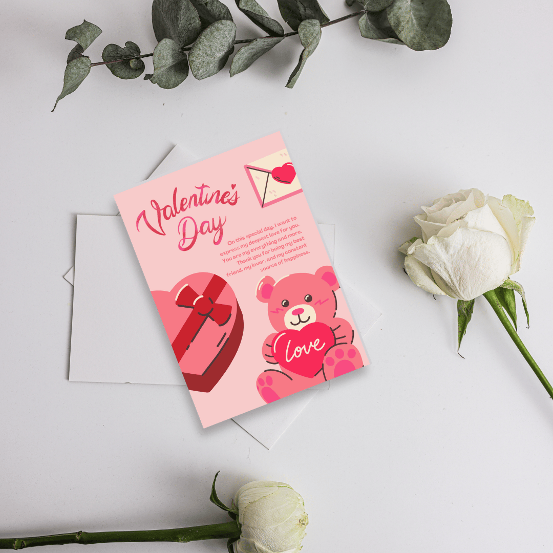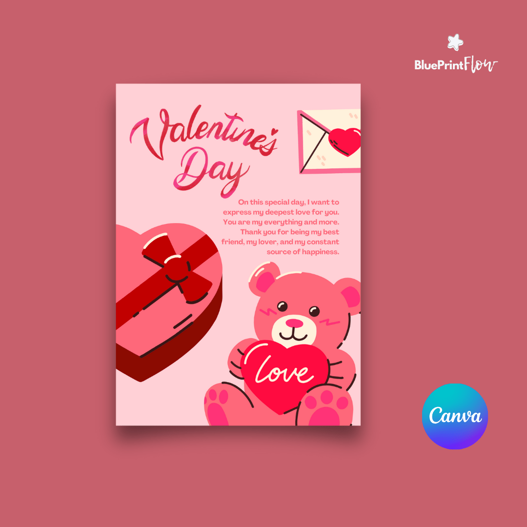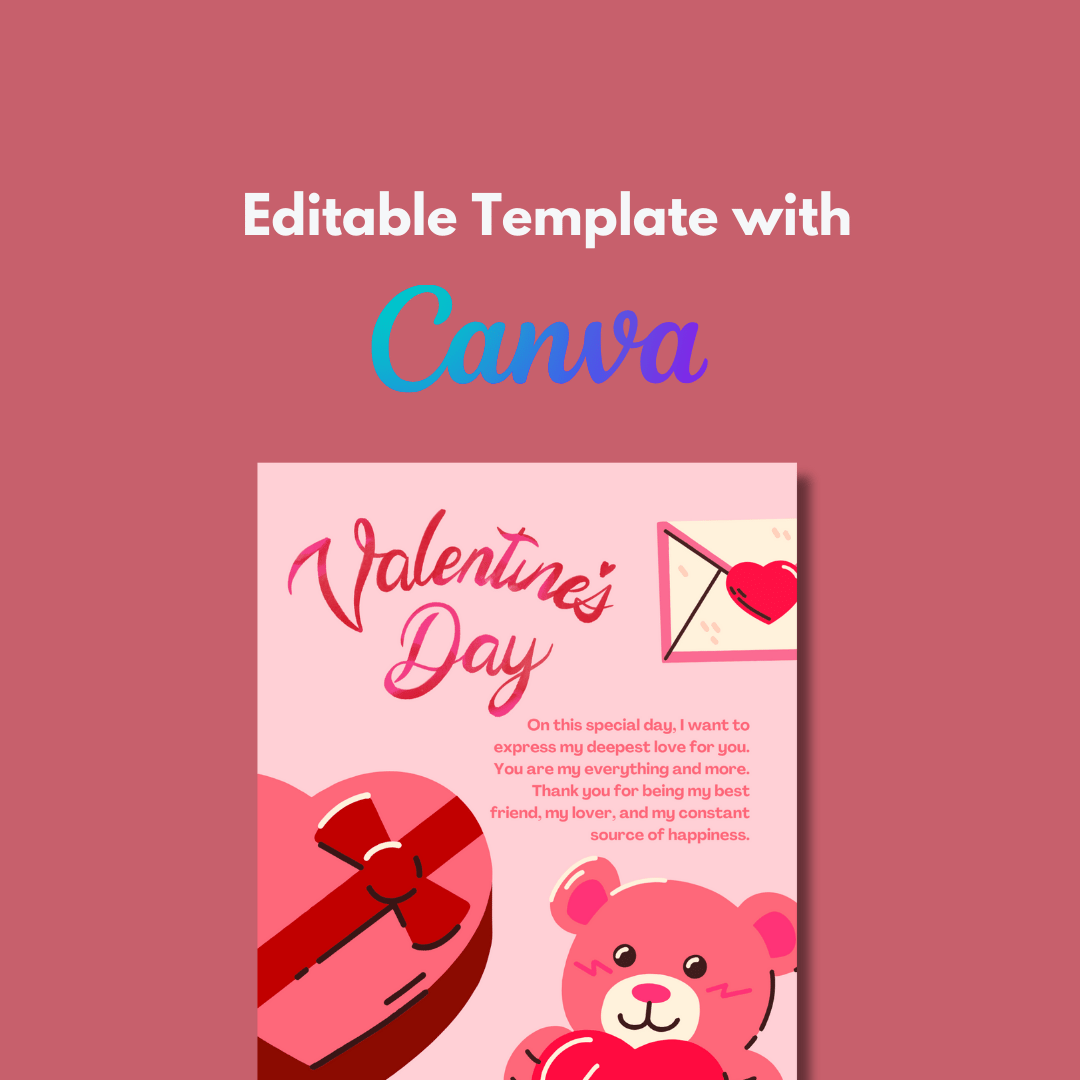 Celebrate love in style with this adorable and colorful Valentine's Day Greeting Card template! Designed in a charming cartoon style, this template features a delightful pink palette, a cuddly teddy bear holding a heart, a love letter, and a box of chocolates. Perfect for expressing your heartfelt emotions on the 14th of February, 2025, this editable and printable card is ideal for sharing with your loved ones.