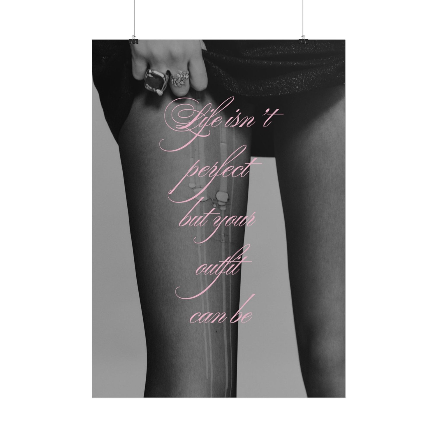 This striking black-and-white image captures a powerful fashion statement with a bold touch of vulnerability. A close-up of a person wearing sheer, torn stockings juxtaposes the elegance of their outfit and accessories—chunky rings and a shimmering dress. Overlayed with soft pink cursive text that reads, “Life isn’t perfect but your outfit can be,” the visual speaks to the resilience and confidence that style can evoke, even in imperfect moments. A celebration of fashion as self-expression, regardless of flaws.