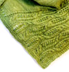 This shawl is an asymmetrical, elongated triangle that grows from one point toward the opposite side. It begins with just a few stitches and as it grows, it forms a wide cable and lace border, later adding on a stockinette body along the top. This pattern will look great in solid or semi-solid colors.