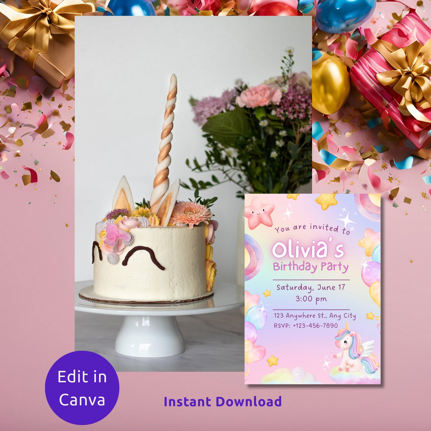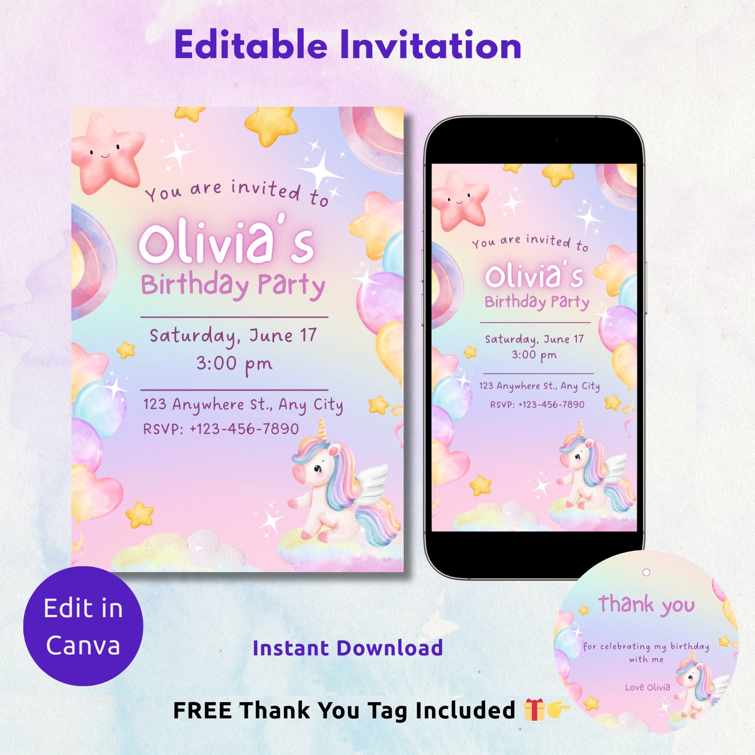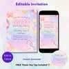Pink Unicorn Birthday Invitation Template | Girls Unicorn Party Invite | Editable Canva Kids Birthday Evite | Printable or Digital invite | Thank You Tag Included