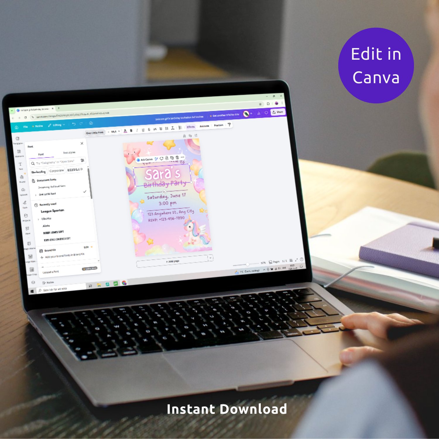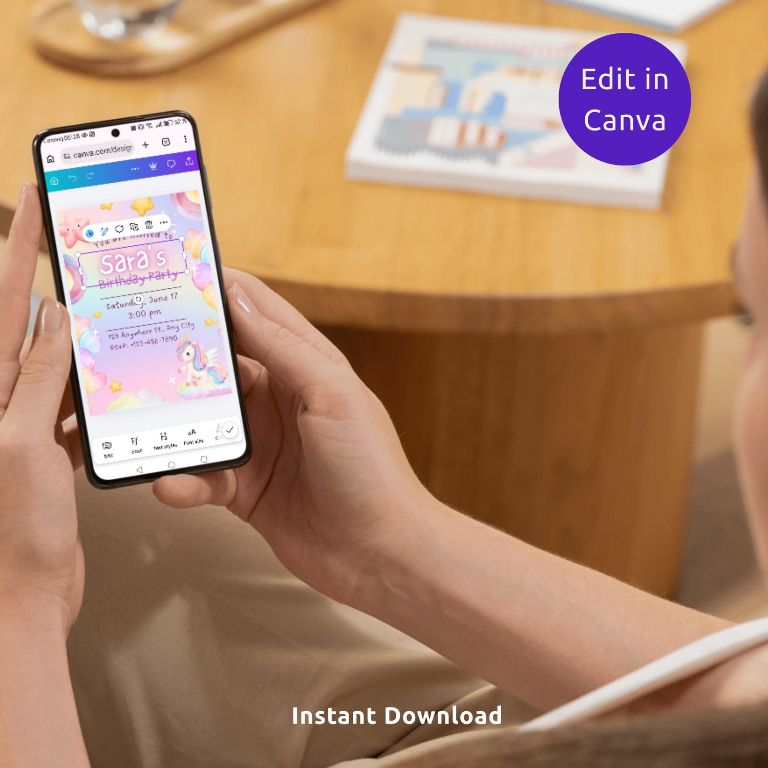 Easily personalize your invitation in Canva by editing the name, age, and party details. Once finished, download your invitation and send it instantly by text message, email, or social media.