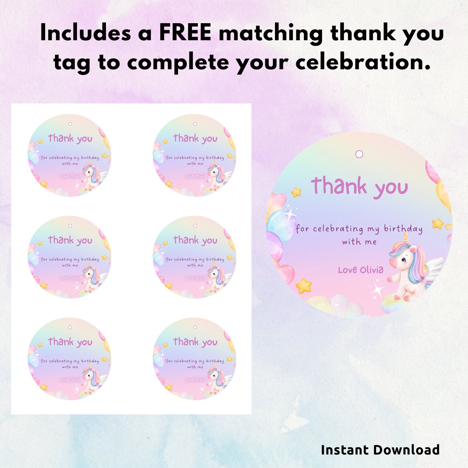 Make your child’s birthday truly magical with this pink unicorn birthday invitation template, perfect for a fun and colorful girls unicorn-themed party. Designed with a dreamy and playful style, this invite is ideal for little ones who love unicorns, rainbows, and princess celebrations. Includes a FREE matching thank you tag to complete your celebration.
