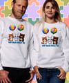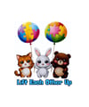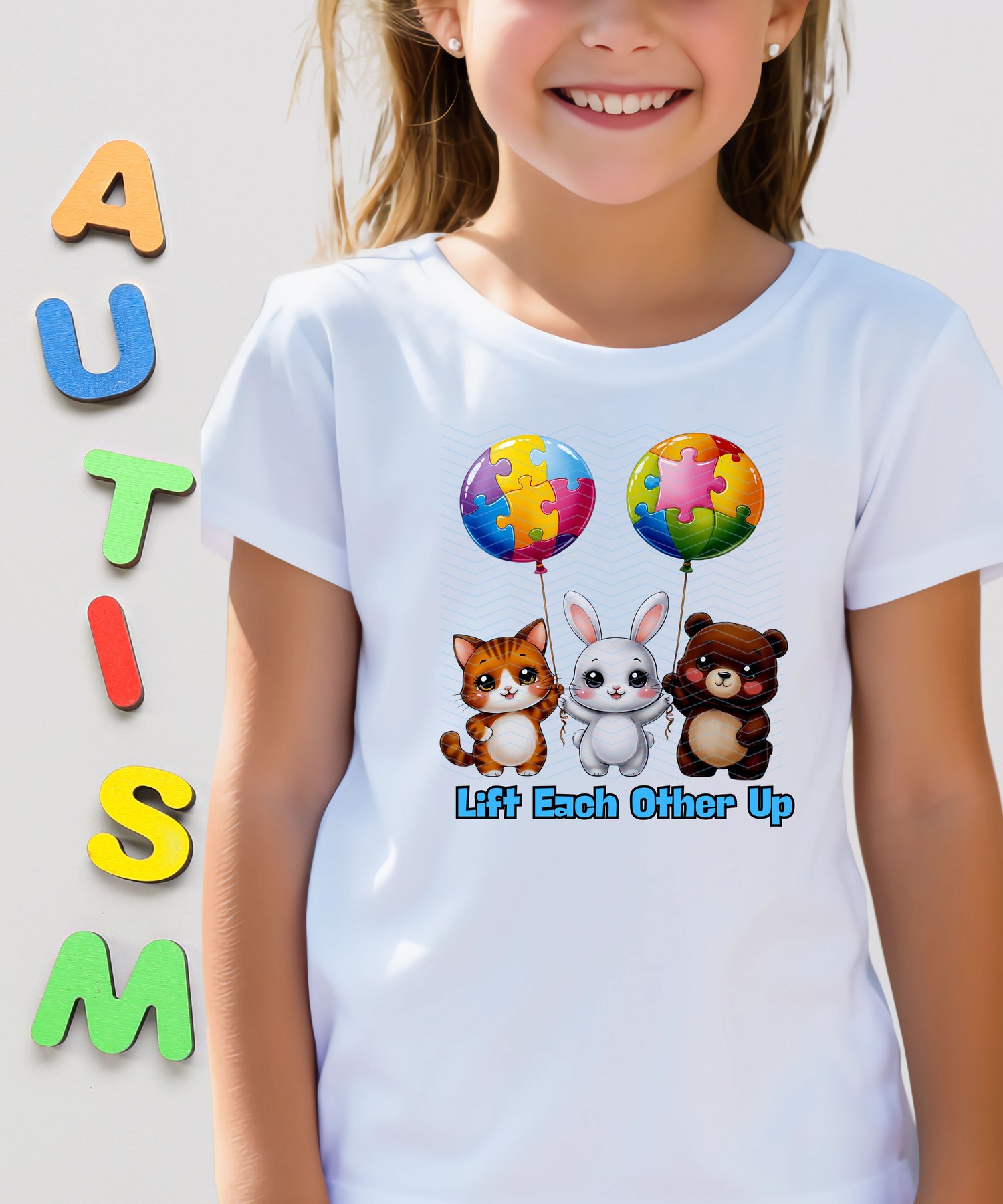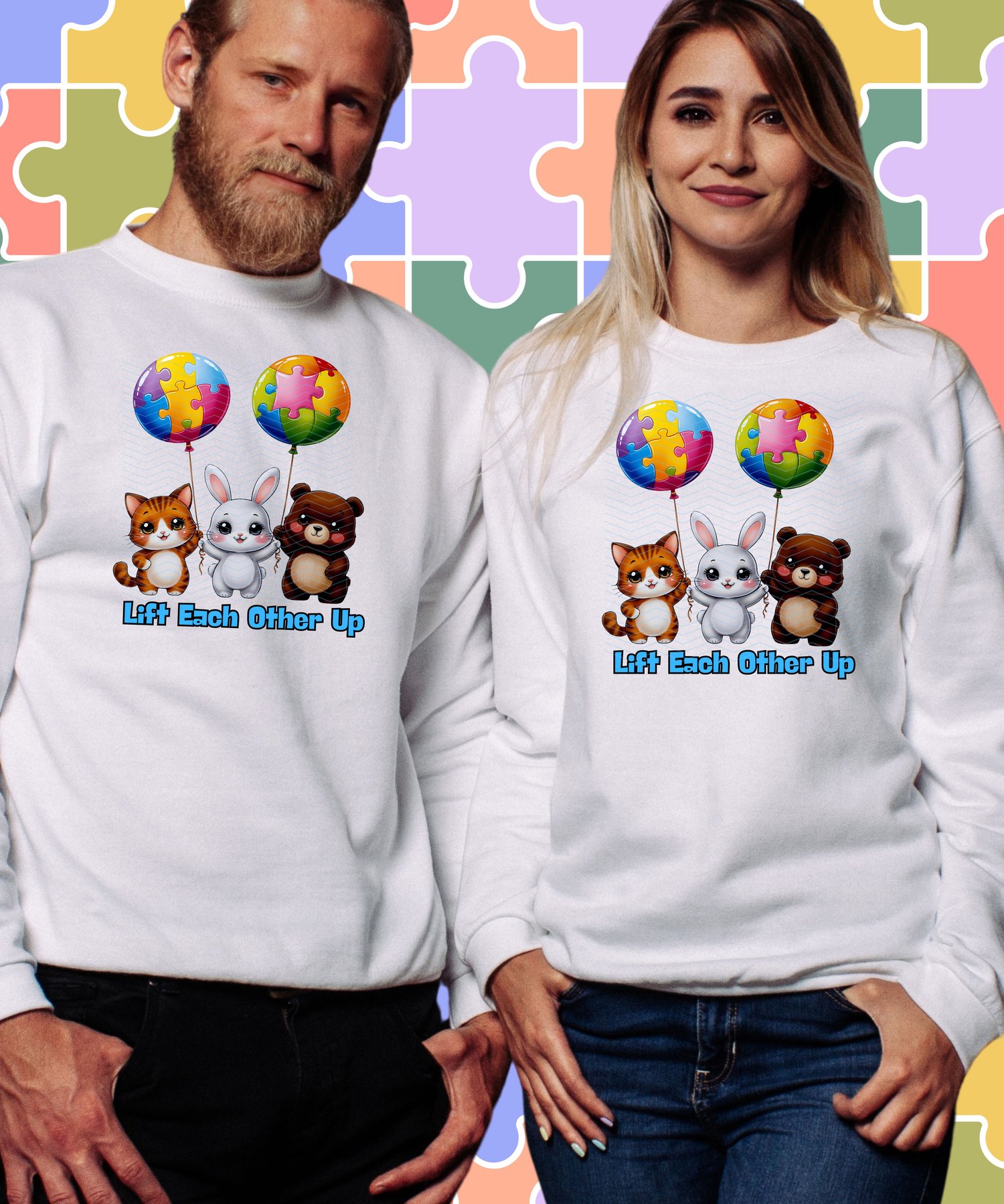 Show the power of friendship and support with this adorable design! A fox, rabbit, and bear hold colorful puzzle-piece balloons, symbolizing love and encouragement for those with autism. This uplifting illustration is great for prints, apparel.
