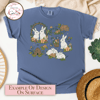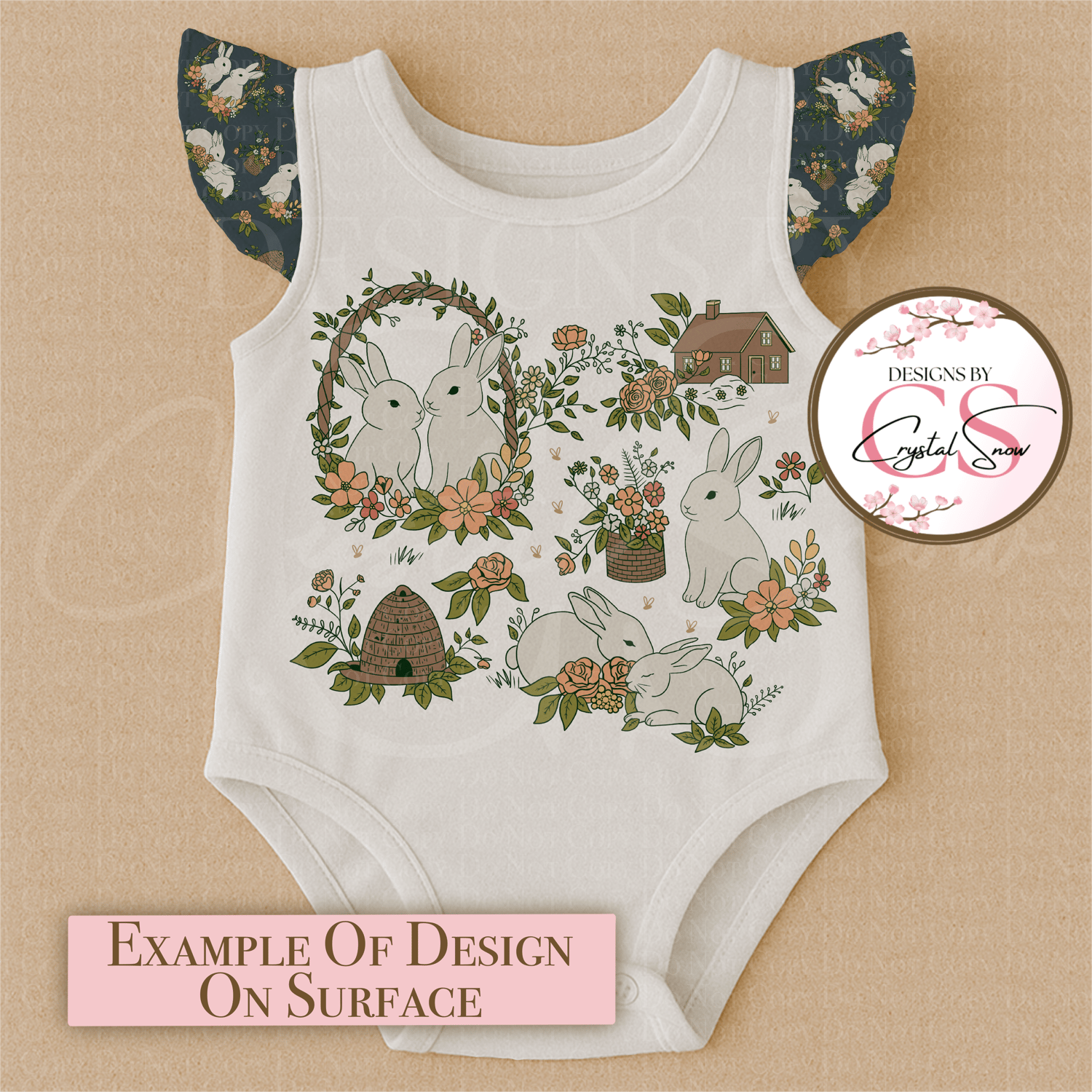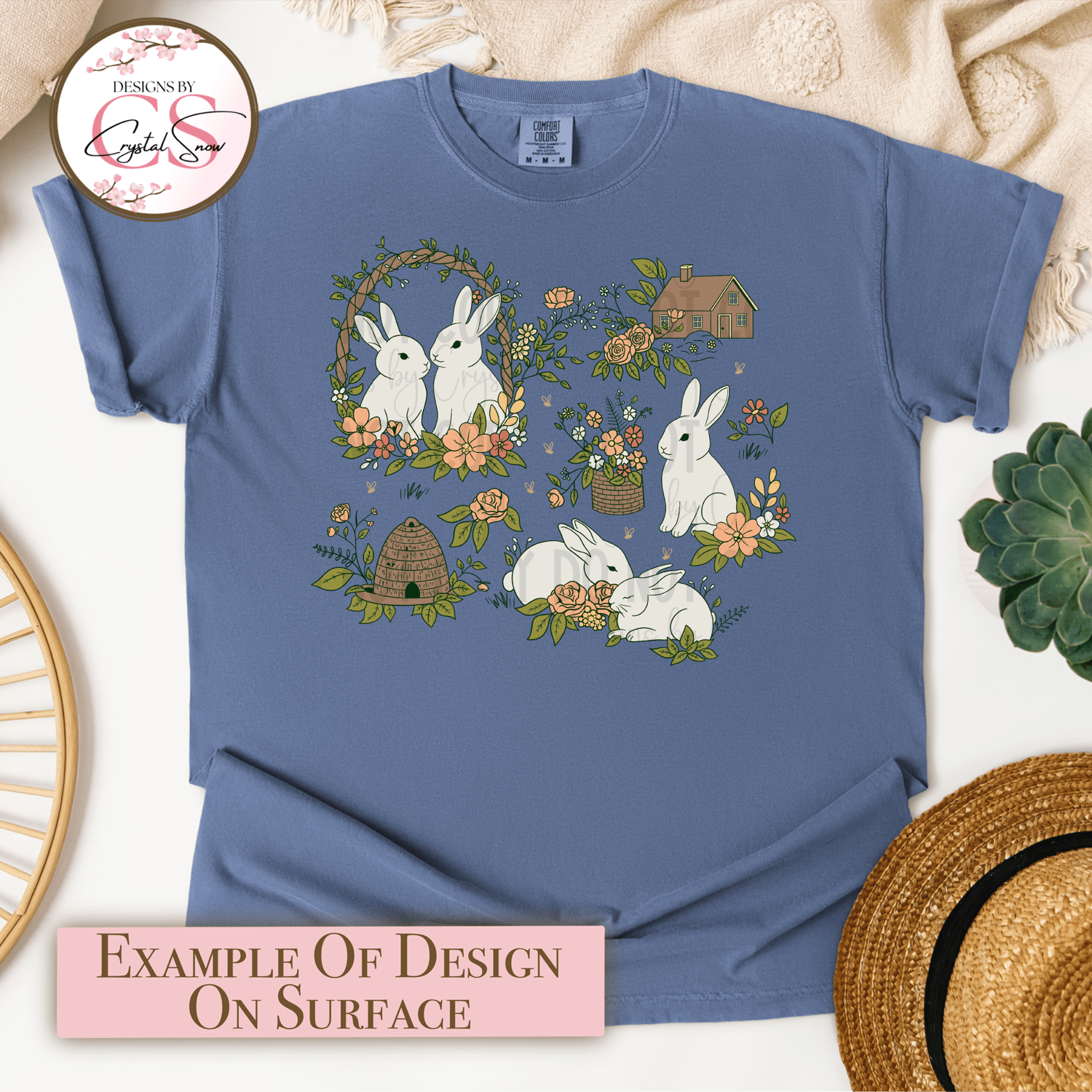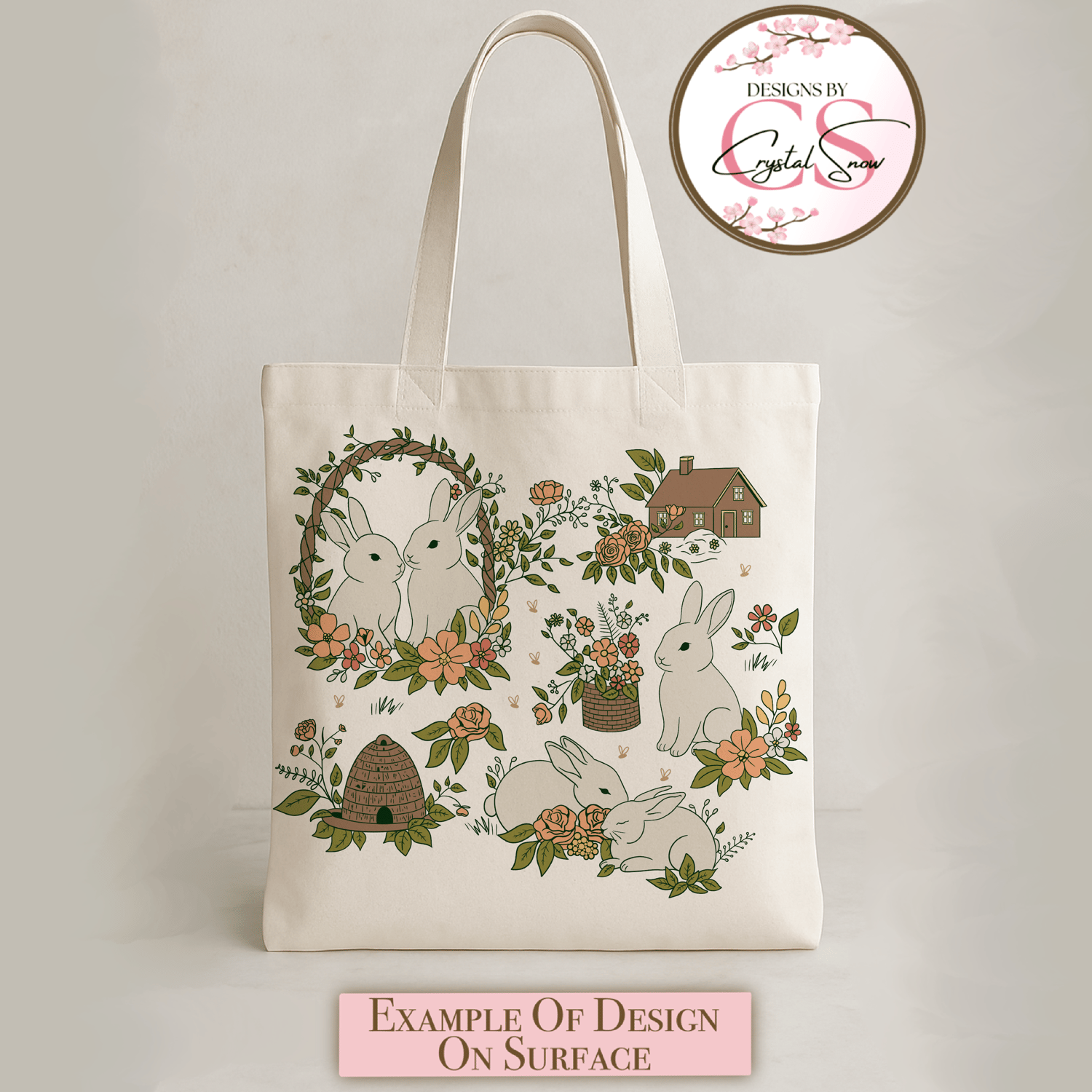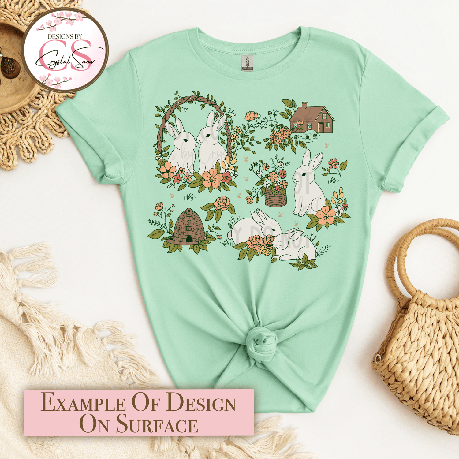 This hand-drawn bunny meadow clipart features sweet rabbits, florals, baskets, and a cozy cottage scene designed to mix beautifully into crafts, apparel, nursery decor, and handmade goods. The artwork has a warm, woodland feel that works beautifully on fabric, totes, shirts, baby items, and printable decor.