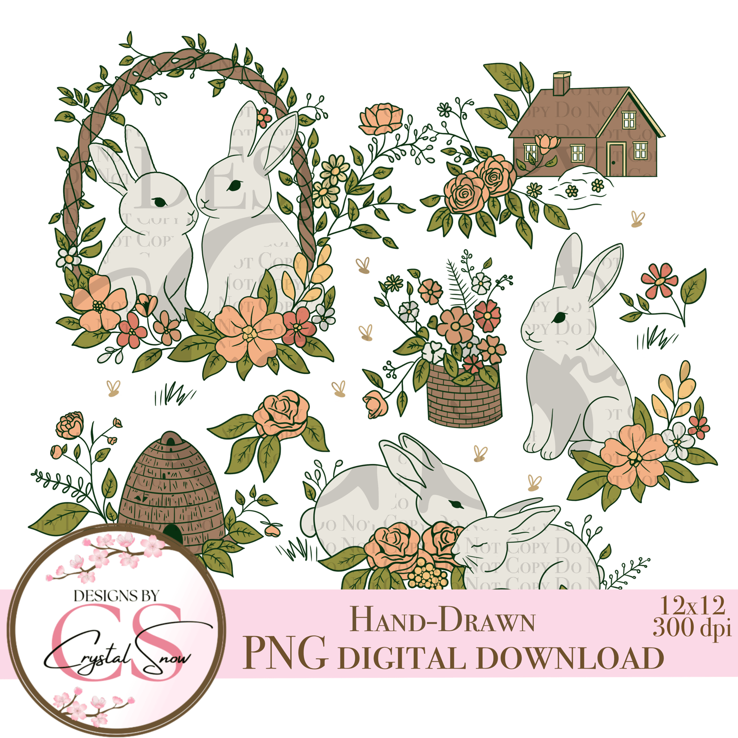 Soft, storybook-style bunny illustrations with cozy cottage charm—perfect for spring, Easter, and cottagecore-inspired projects.