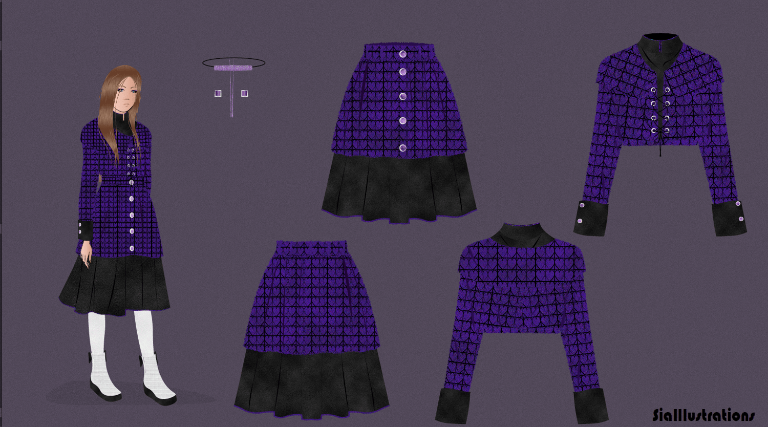 Get your furry fashion on!!! "Winter 2021 Fur Collections Illustration" brings two new designs for your winter wardrobe. The first outfit is a knee-length black fur shirt with a turtle neckline and long bishop-style sleeves. The outfit is completed with decorated blue skinny jeans. The second outfit is a combination of a purple fur crop top with a double-layered A-line skirt. The crop top is designed with an upper black mandarin neckline and a lower oval neckline with a rounded purple fur collar. The illustration is available in high-quality resolution in both PDF and PNG files.