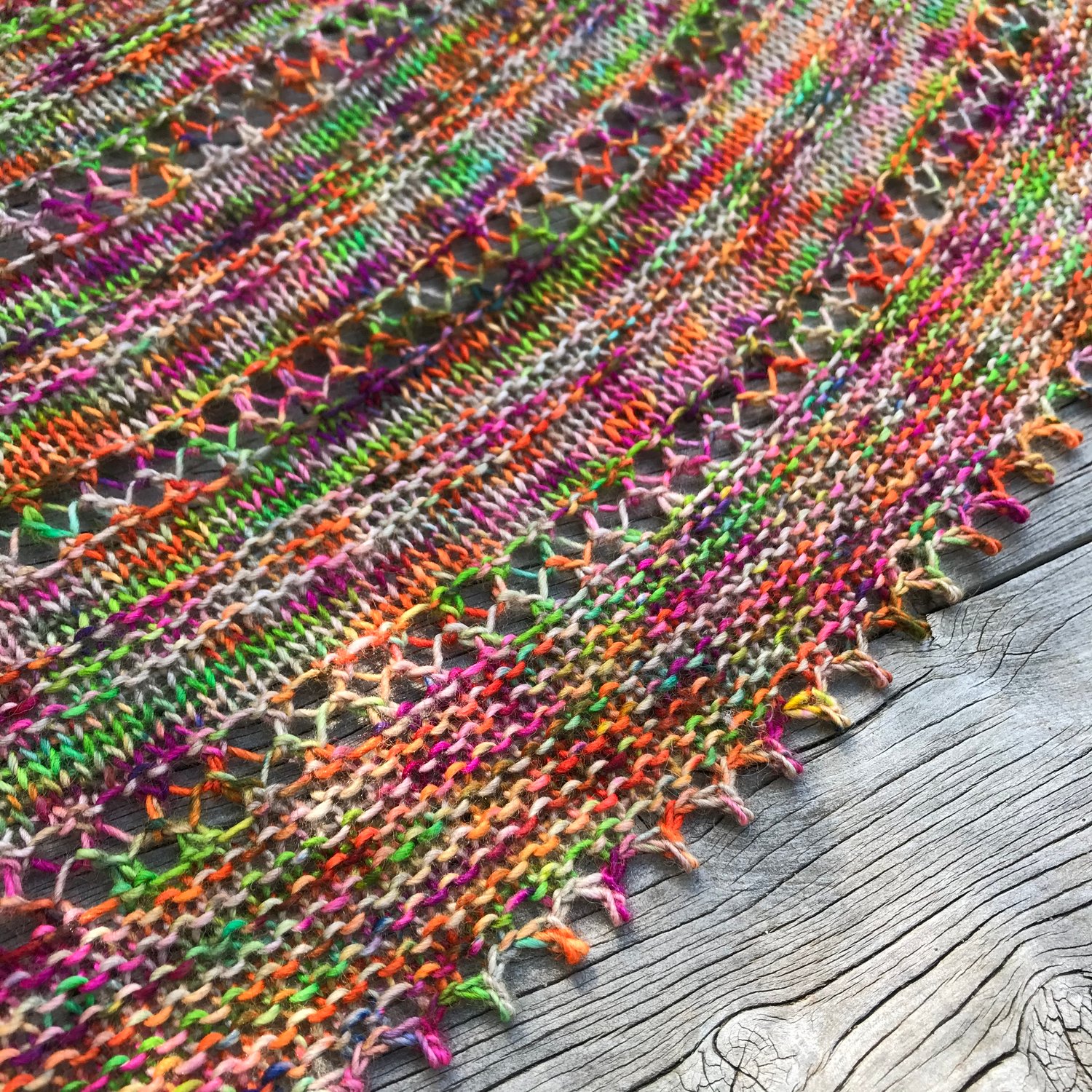 The pattern contains full written instructions and chart. A tick-sheet is also provided, which includes pattern and colour placement, stitch counts, and lace row instructions. Once the set-up section is completed, the entire shawl can be worked from the one page tick-sheet for easy reference if you want to, making this the perfect social project.