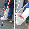 After his phone call, he heads towards the bus stop. We accompany him. He is visibly inexperienced and has difficulty keeping his balance with the crutches. Several times it seems as if he is falling. But he manages and sits on the bench at the bus stop. There we can admire the cast from almost all sides, especially from the bottom of the foot, as he supports his leg on the other knee. He sits there for several minutes and when his bus comes, he carefully gets up and crutches onto the bus.