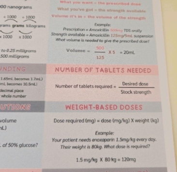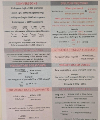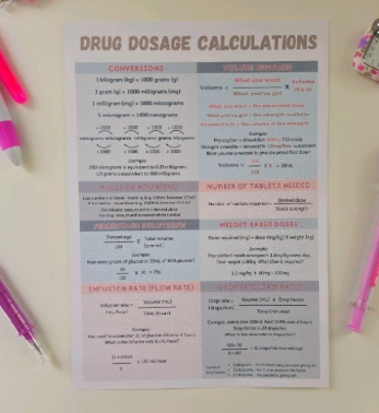 Drug Dosage Calculations A4 Chart Poster for Student Nurses and Midwifery Healthcare Workers - NHS Placement and Revision