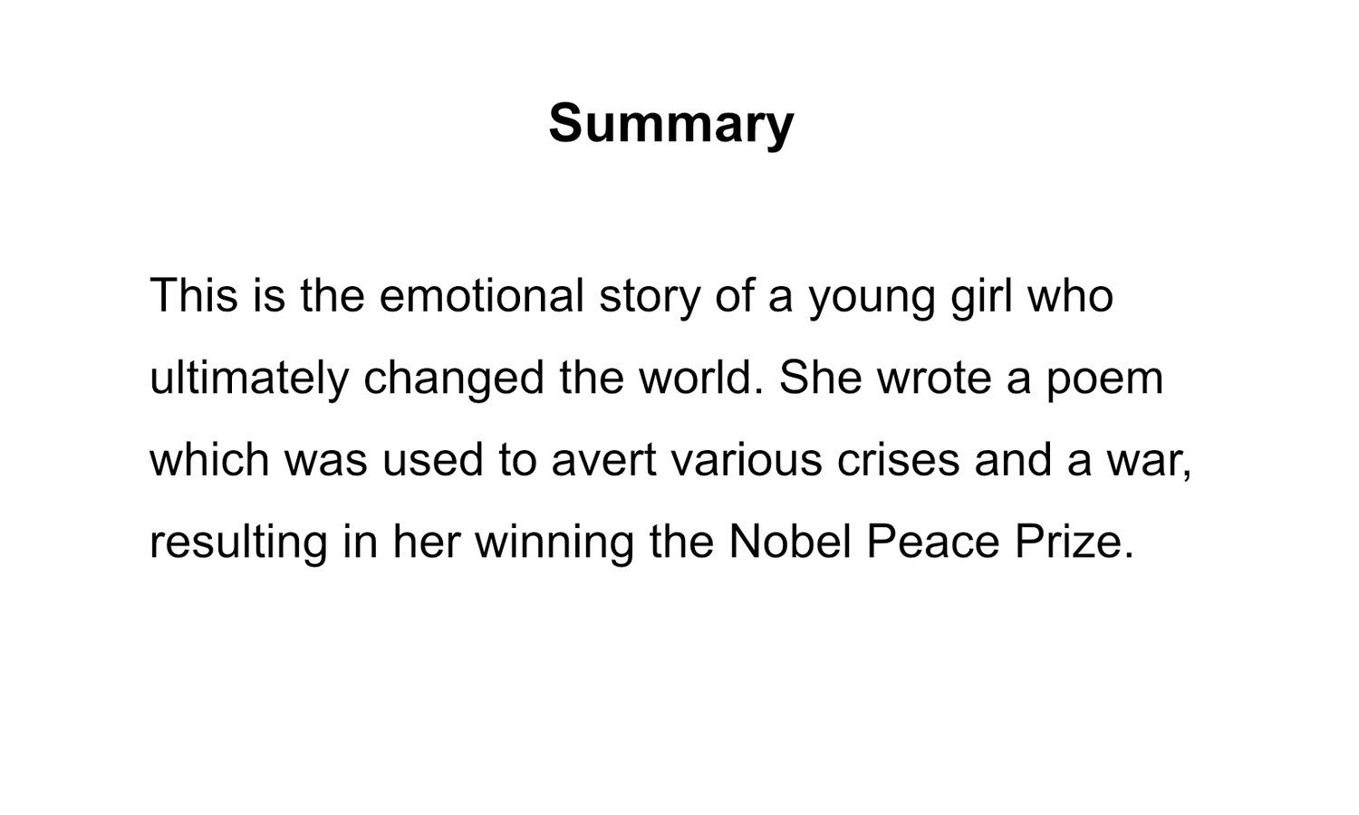 Free Audio Preview! Book & All Chapters of Audio including poem. This is the emotional story of a young girl who ultimately changed the world. She wrote a poem which was used to avert various crises and a war, resulting in her winning the Nobel Peace Prize.