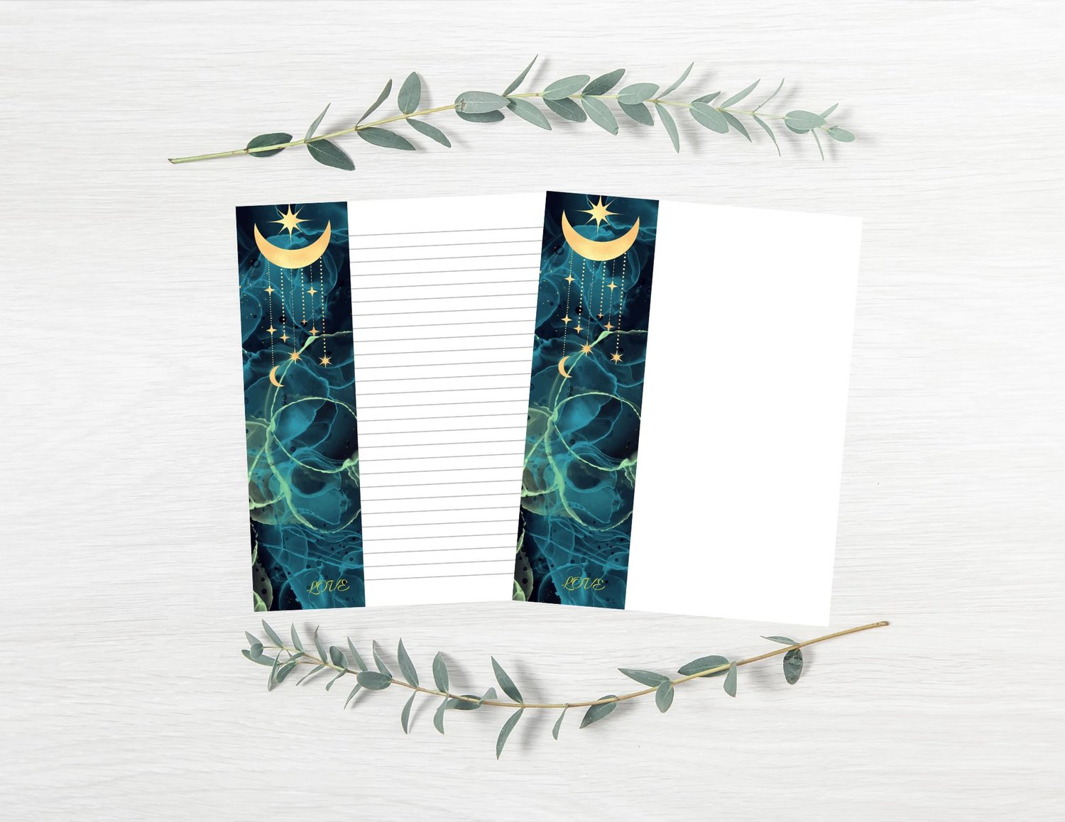 - 4 pages of gorgeous green alcohol ink pictures with a celestial gold moon and sun and the words love written on each page.